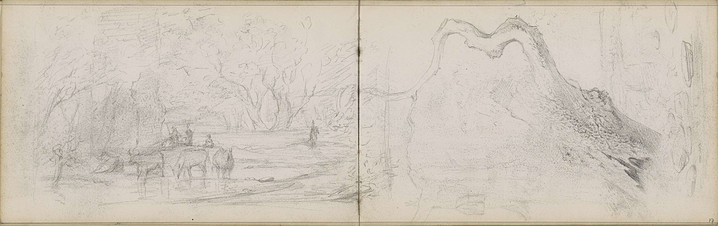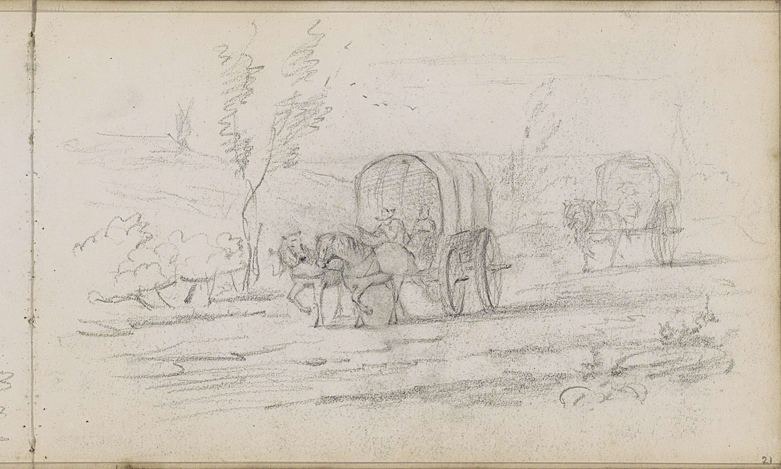 Landschap met twee huifkarren op een pad