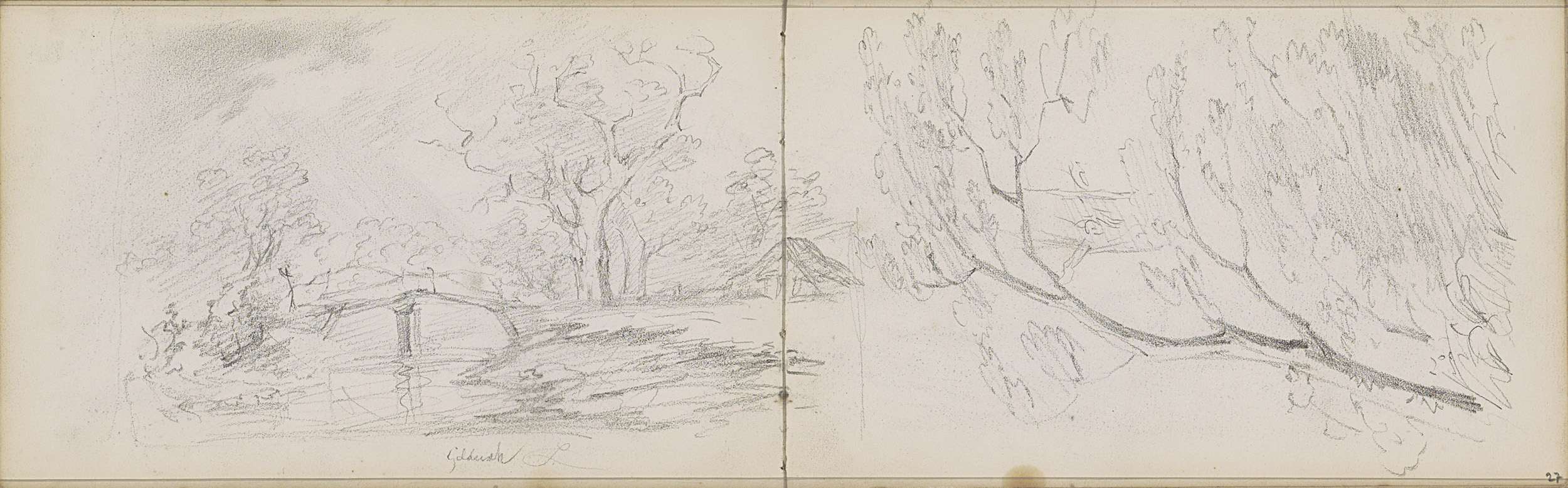 Landschap met twee figuren bij een kruis en brug