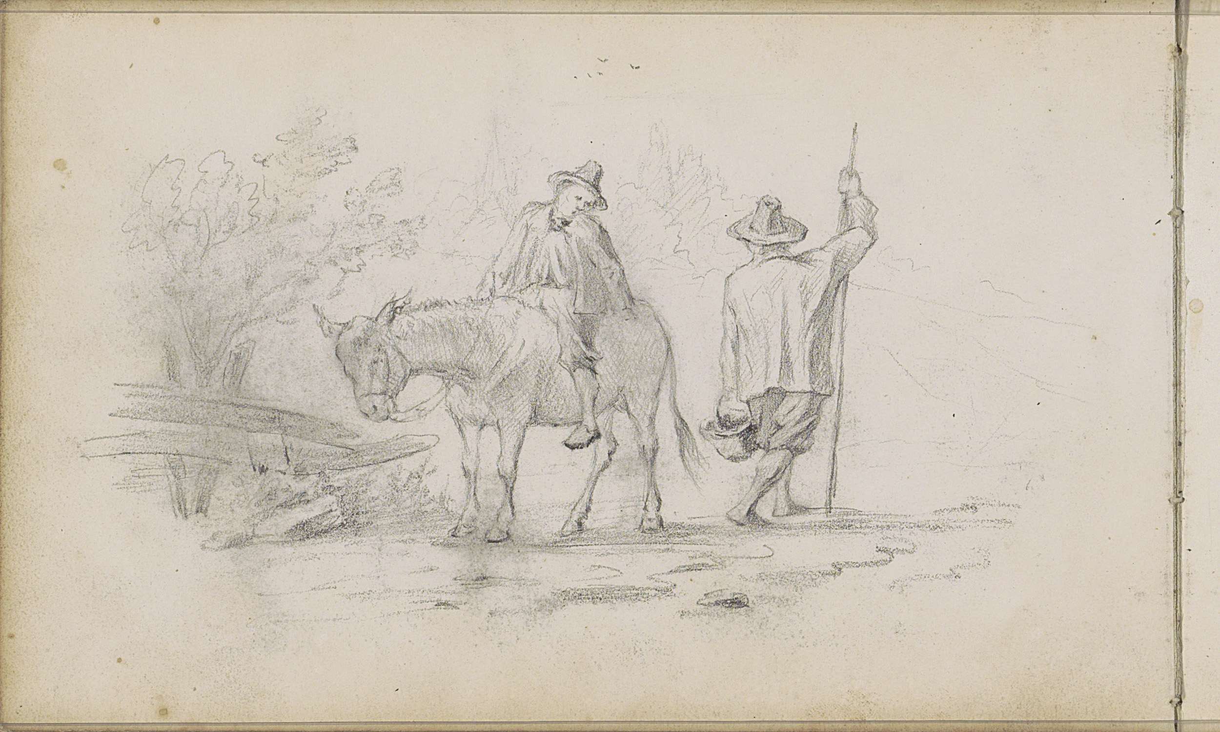 Wandelaar en een man op een ezel die elkaar kruisen ...