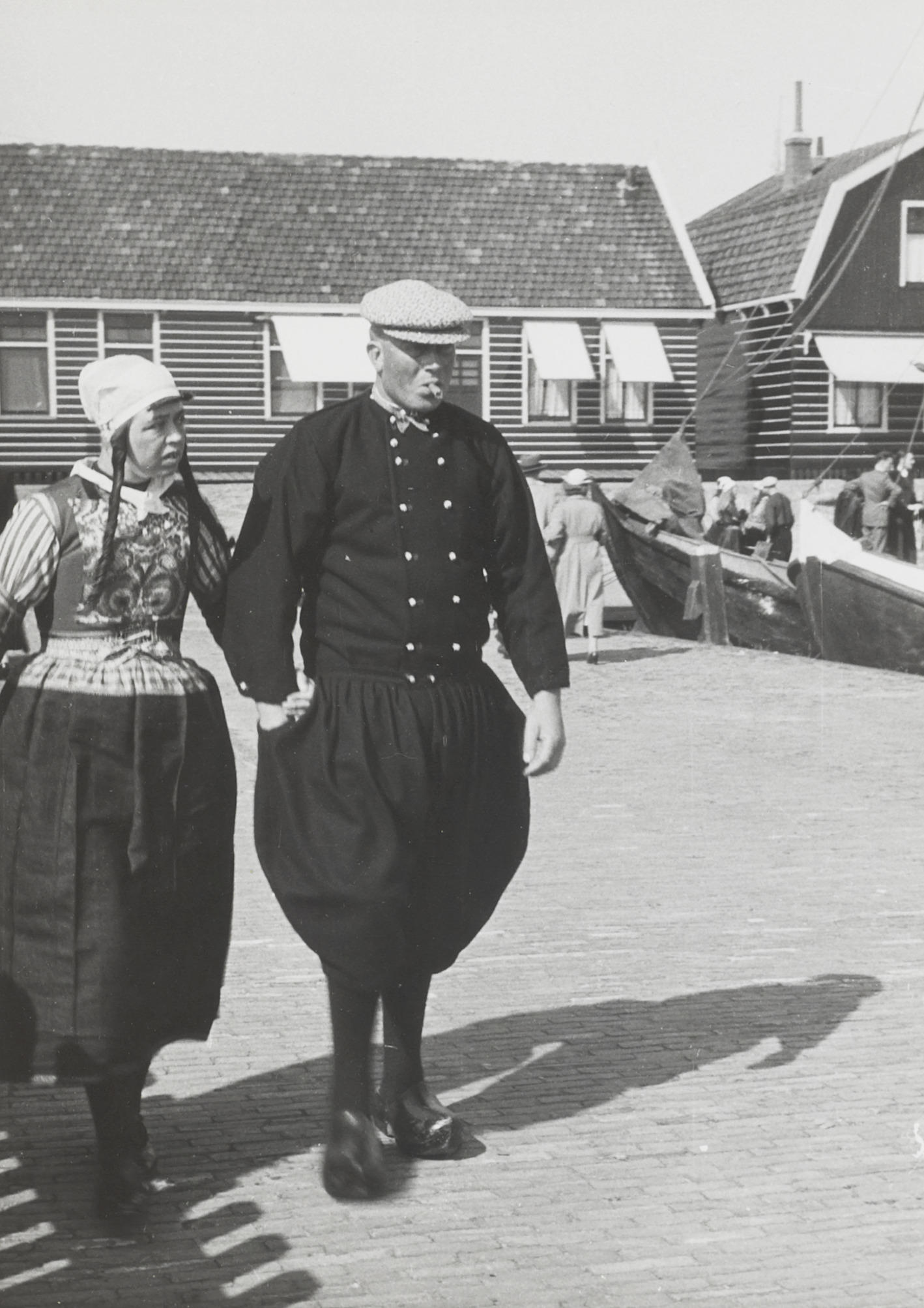 Visser en vrouw in dracht uit Volendam, 1938 (zwart-...