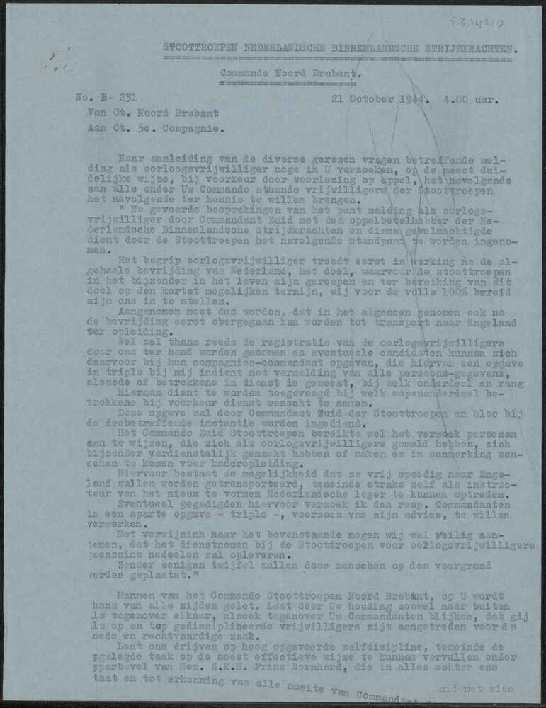 Brief van de Commandant Brabant S.N.B.S. aan Command...
