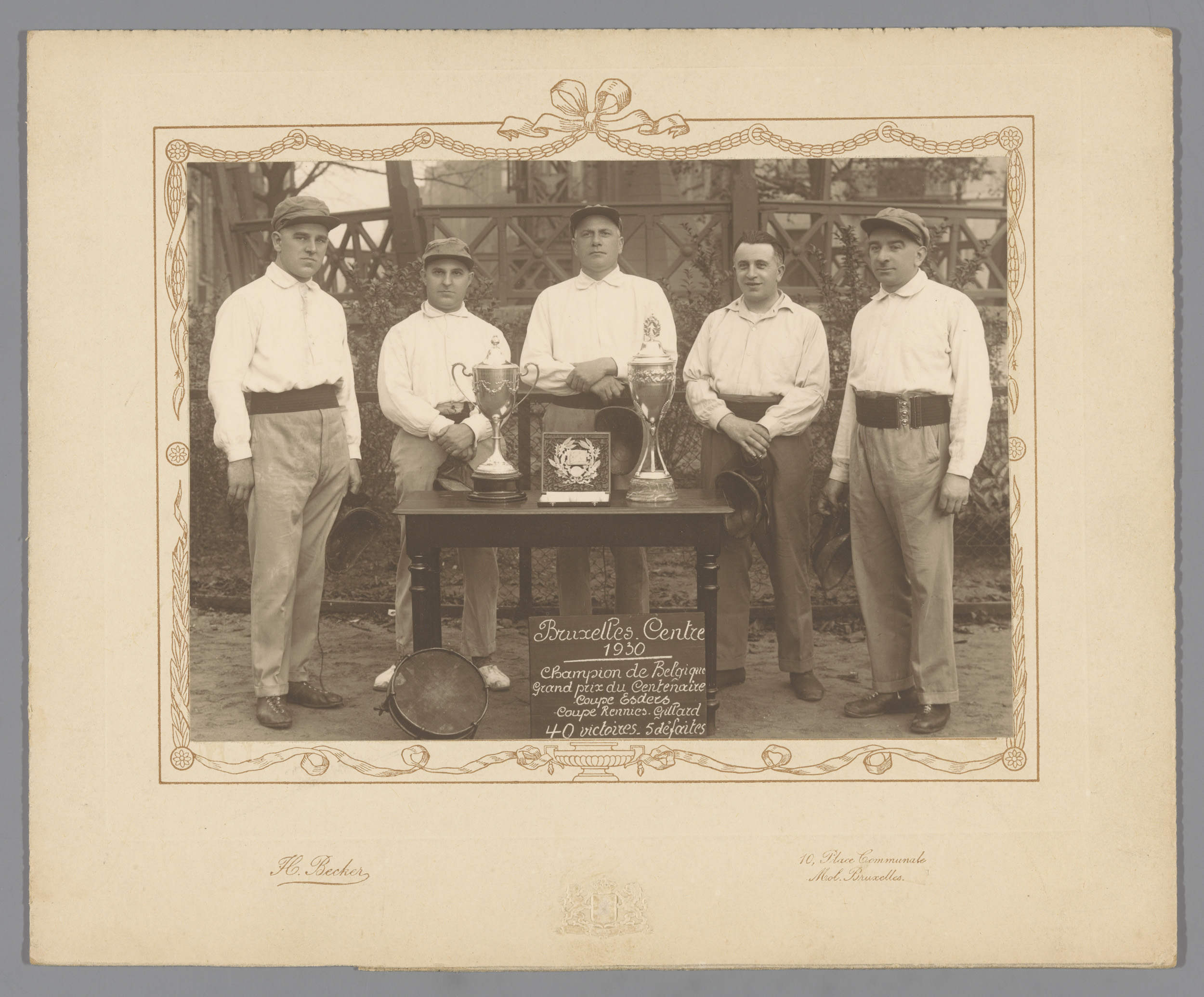Groepsportret van vijf winnaars van (vermoedelijk) e...