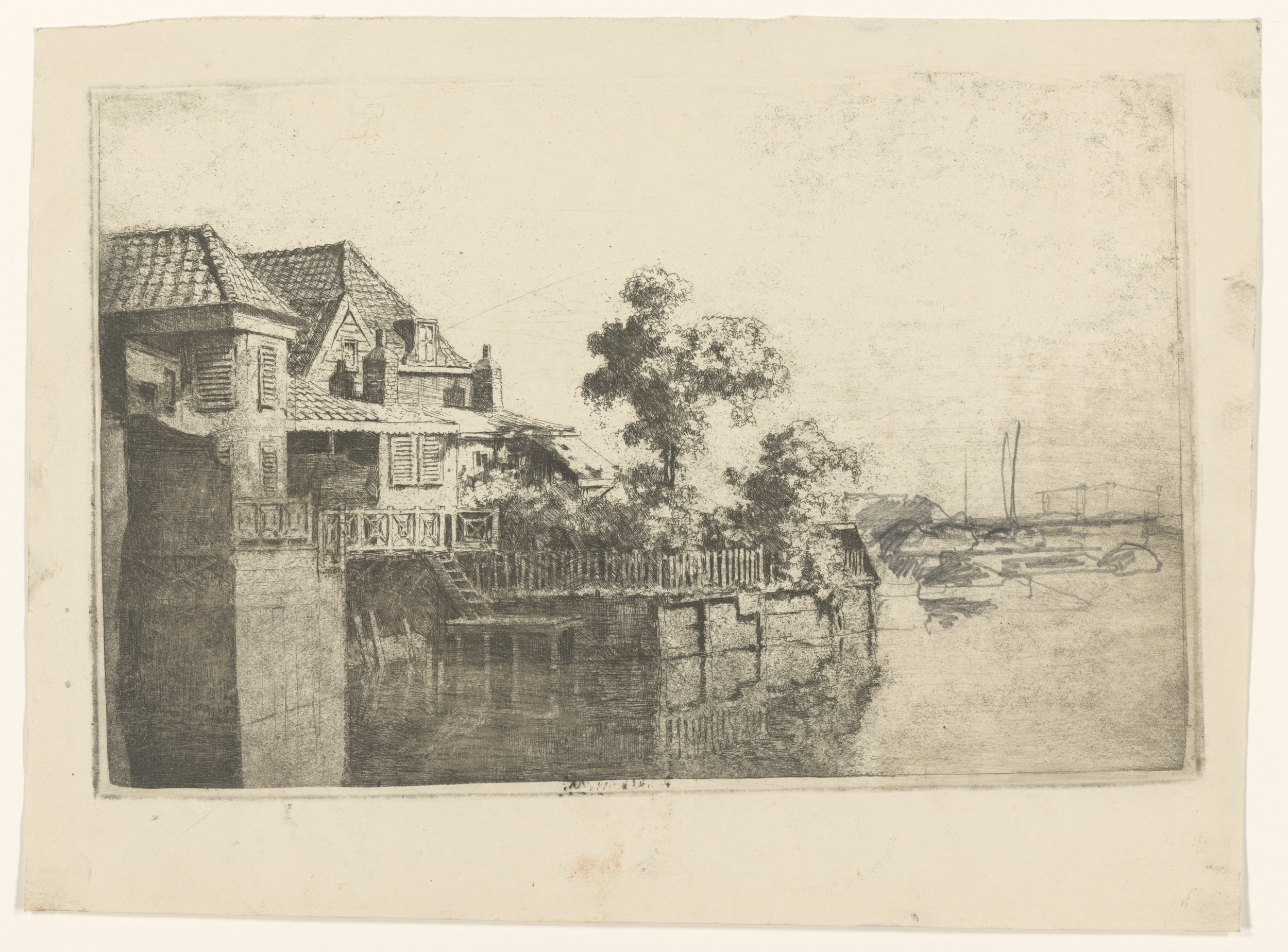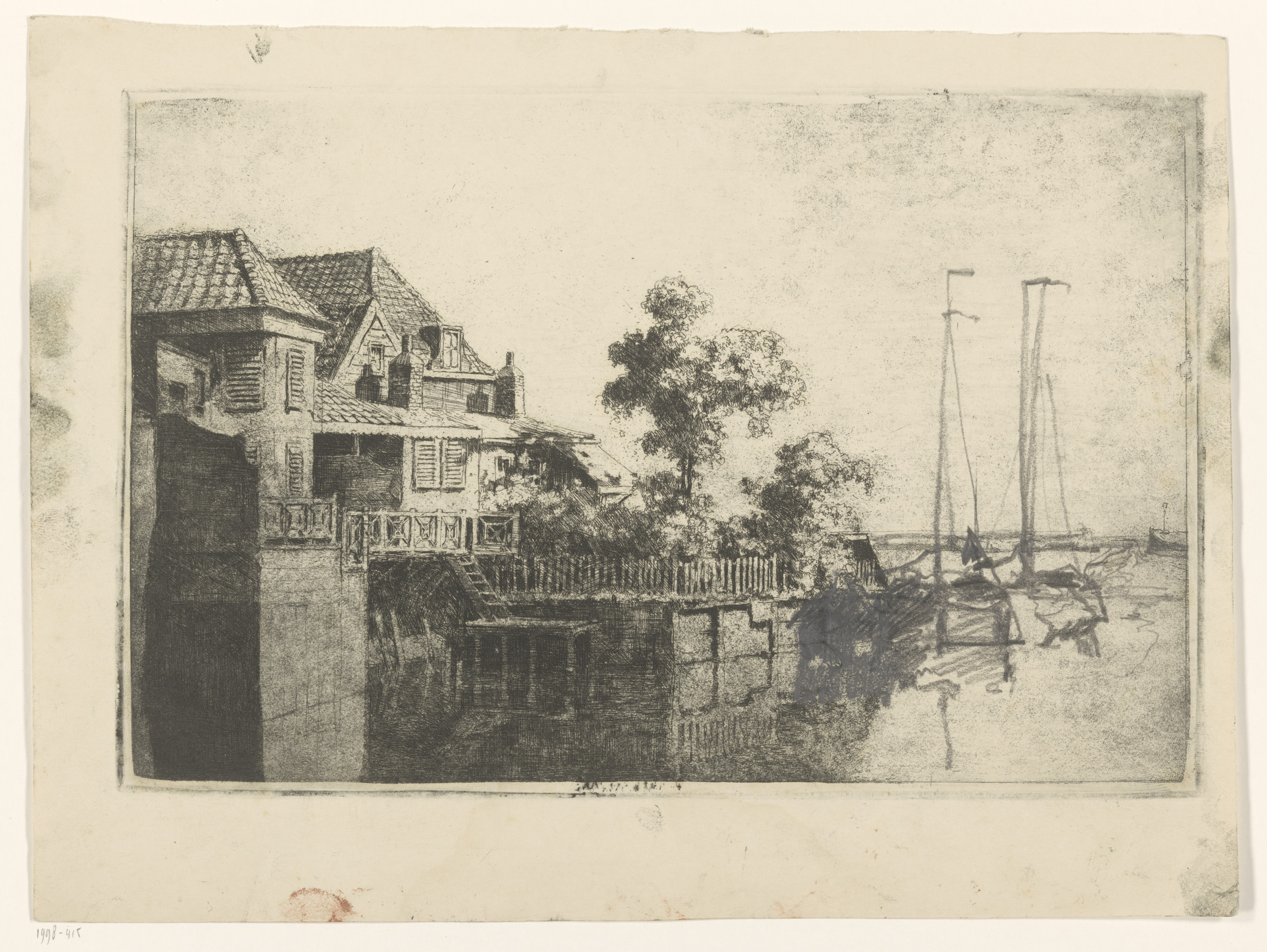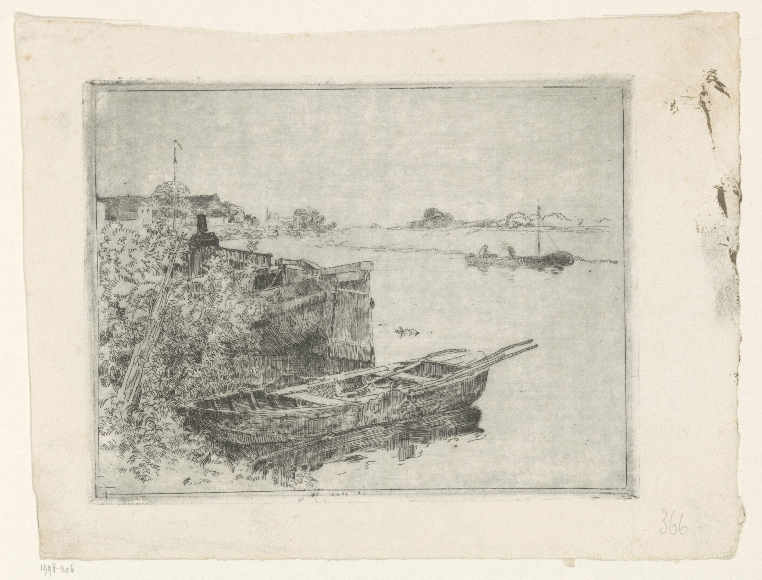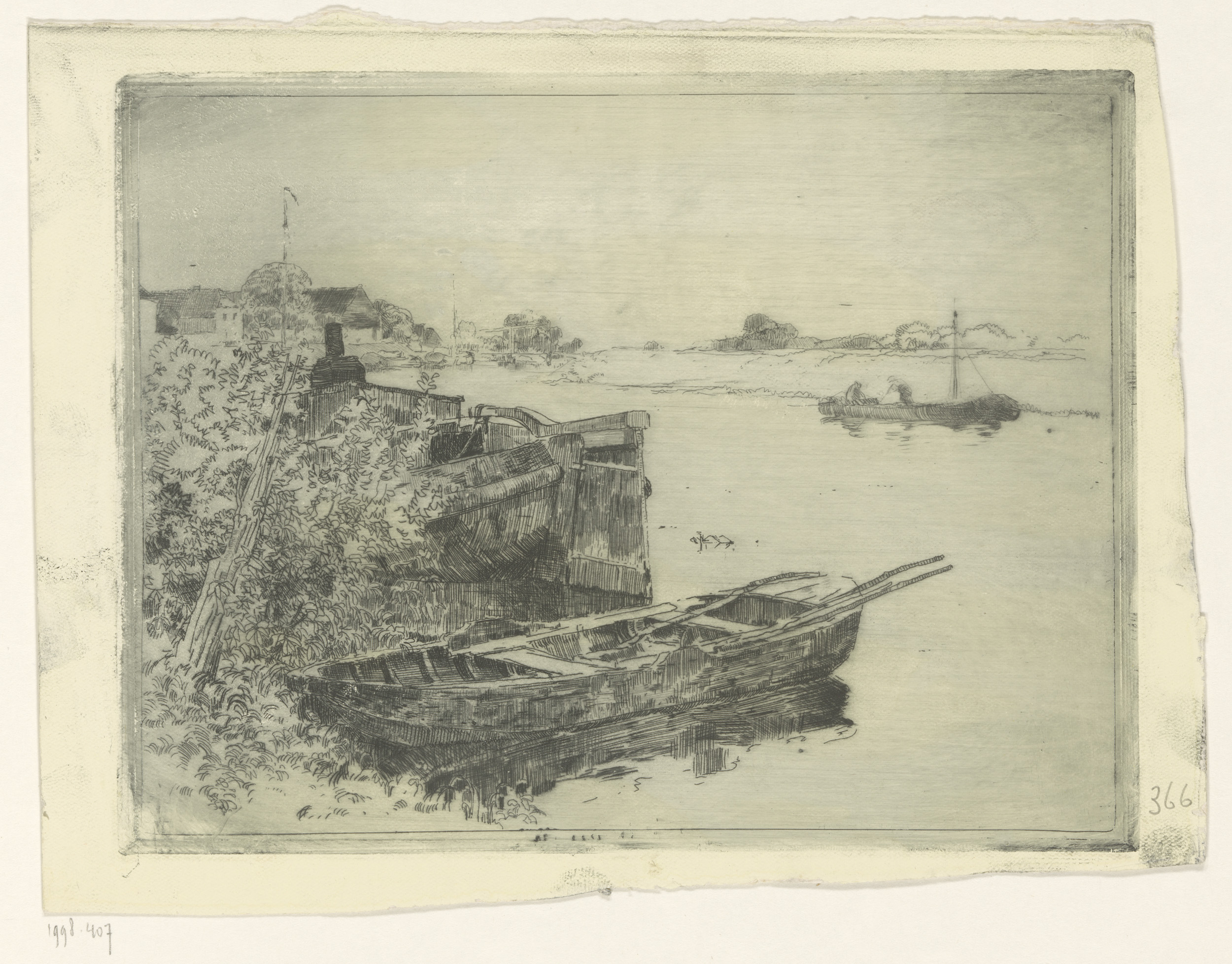 Twee zeilschepen aan een rivieroever