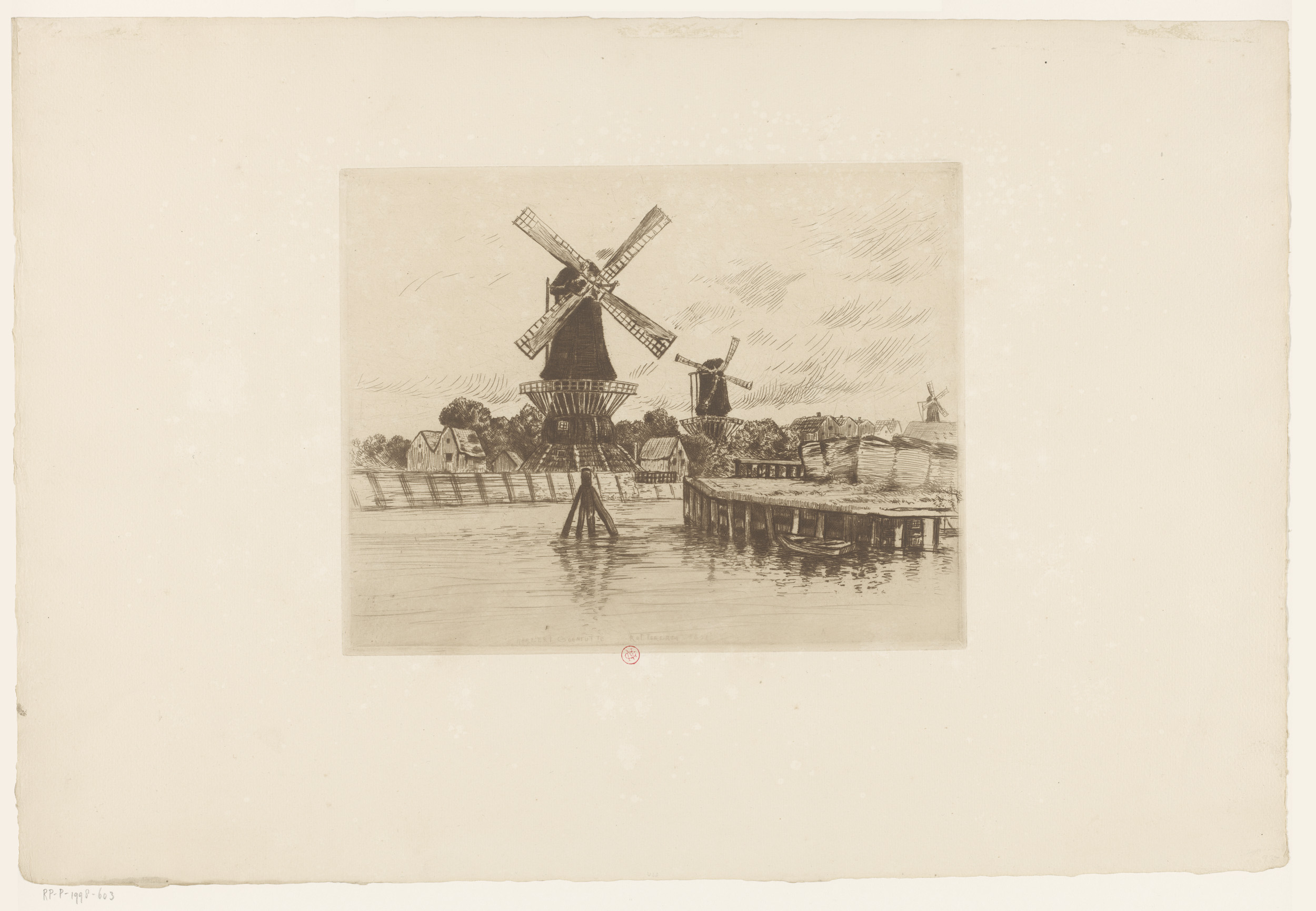 Gezicht op drie molens aan het water te Rotterdam