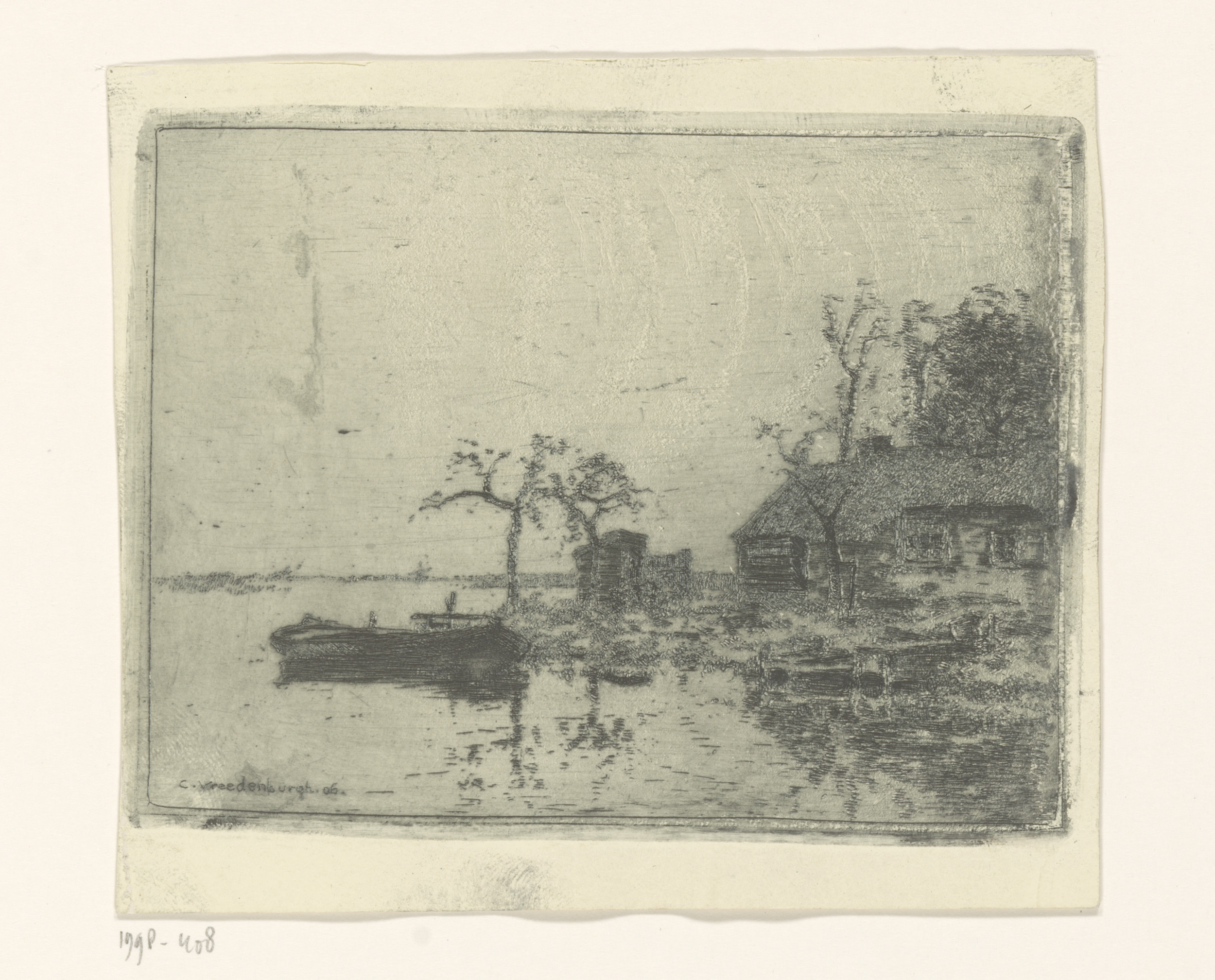 Boerderij aan een sloot, bomen scheef in de wind