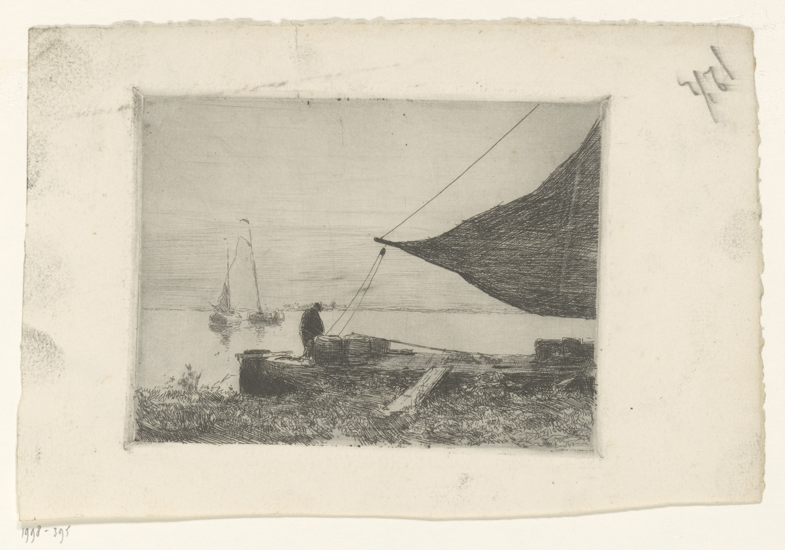 Man op een aangemeerde zeilboot op een meer