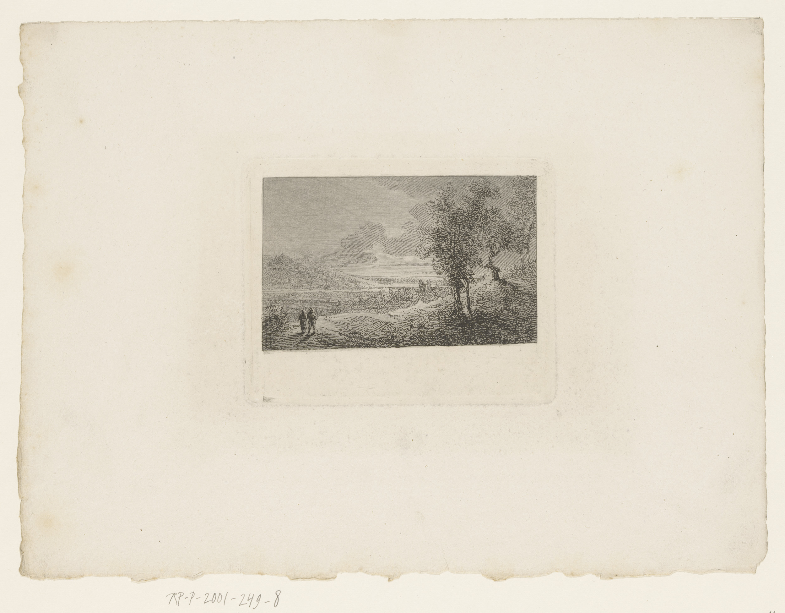 Landschap met twee wandelaars bij zonsondergang