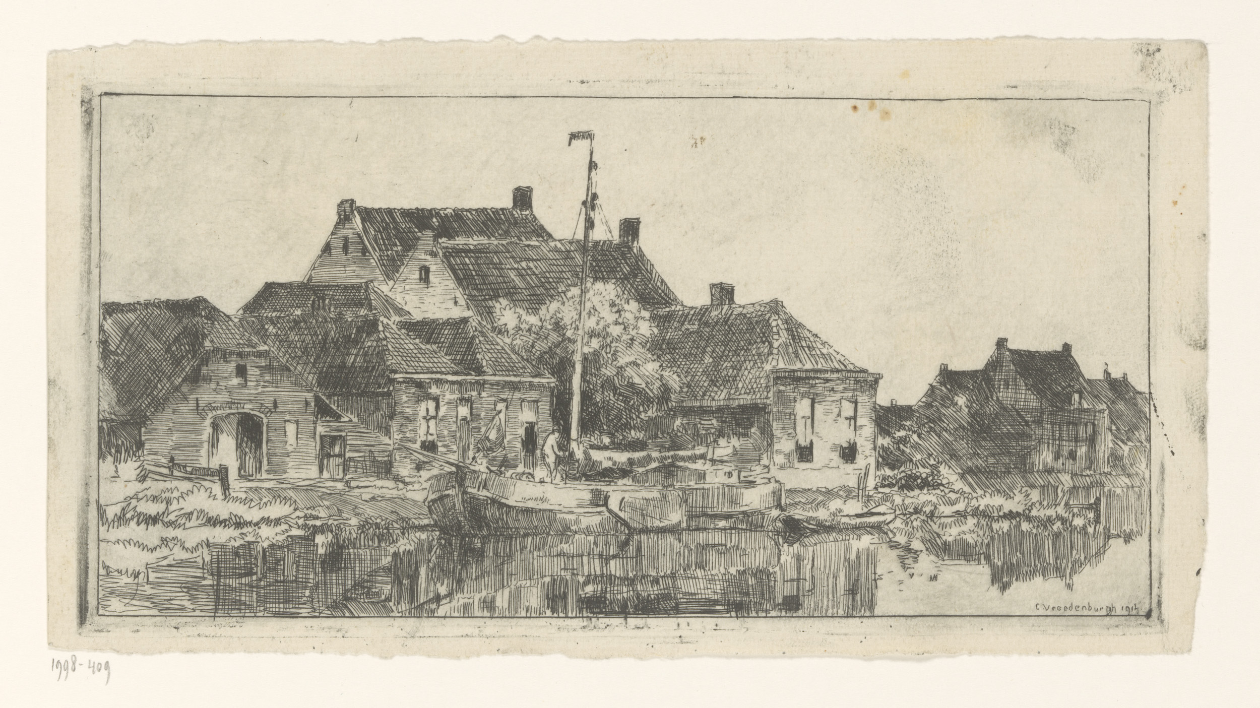 Dorpsgezicht met zeilboot in een gracht