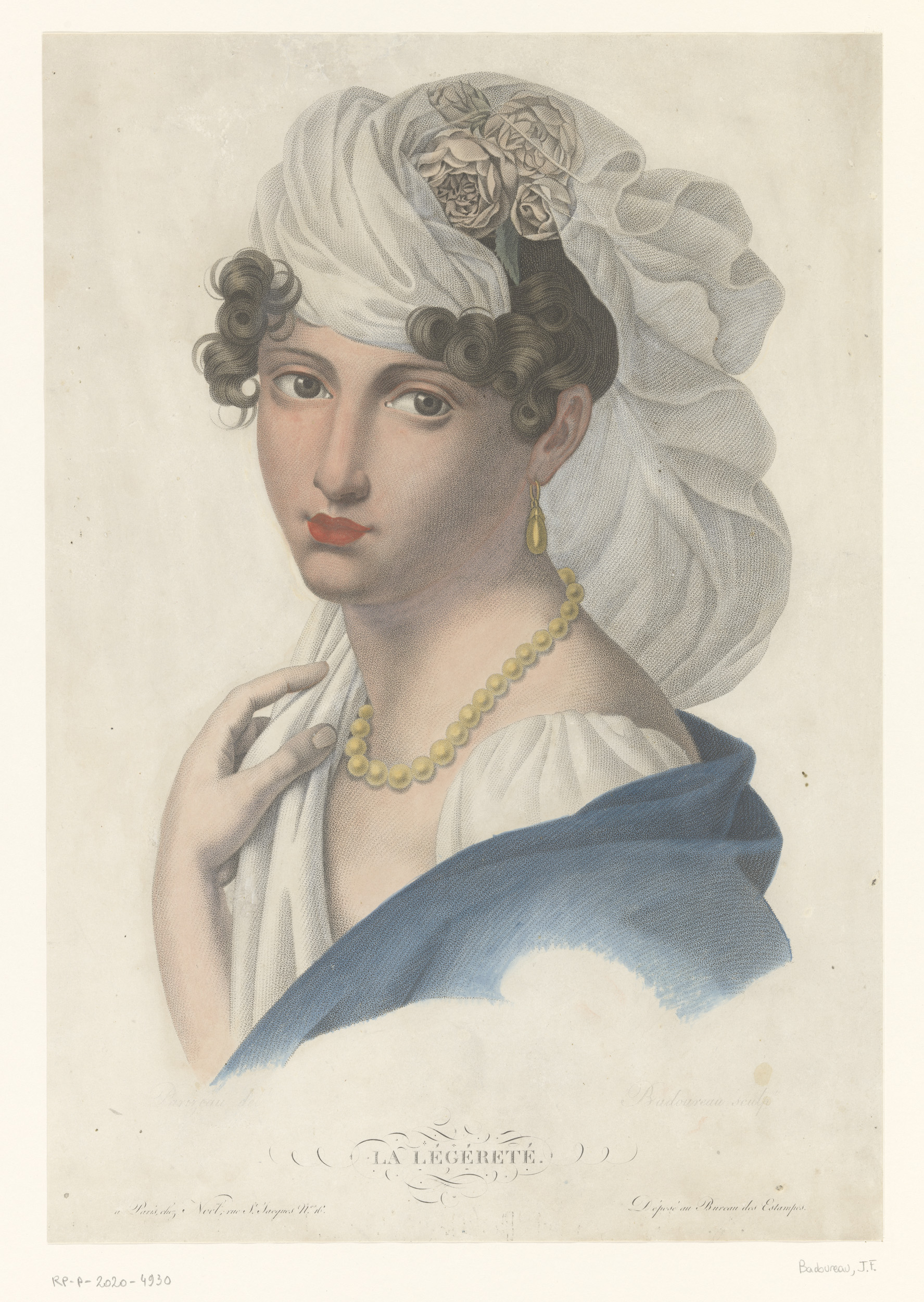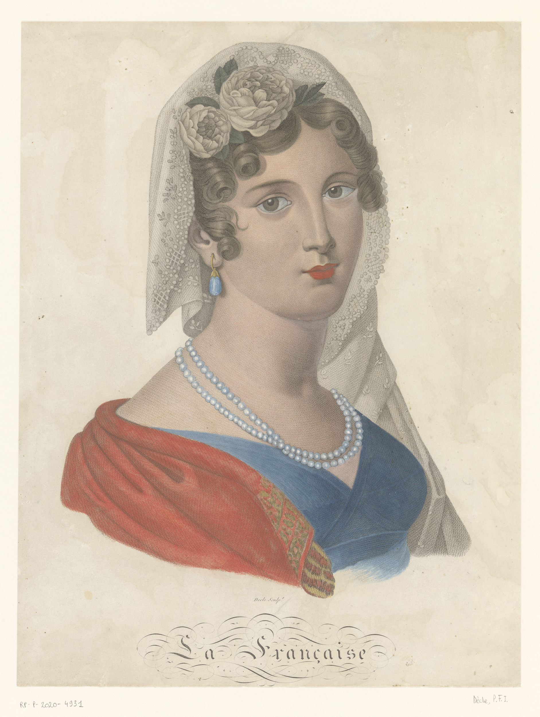 Franse vrouw met oorbel met blauwe edelsteen, witte ...