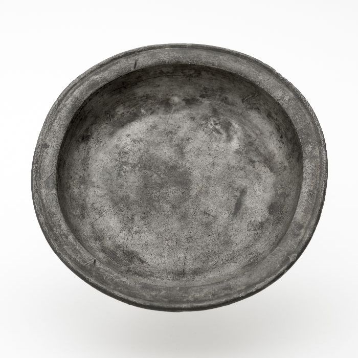 Diep tinnen bord met vlakke bodem en smalle rand
