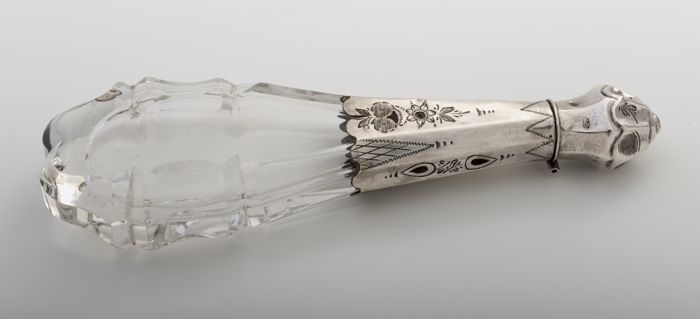 Plat glazen parfumflesje met zilveren dop