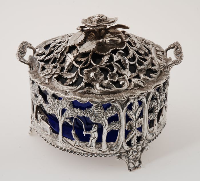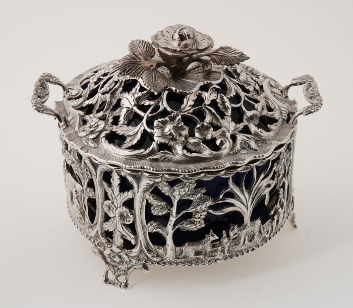 Zilveren opengewerkte botervloot met blauw glazen bi...