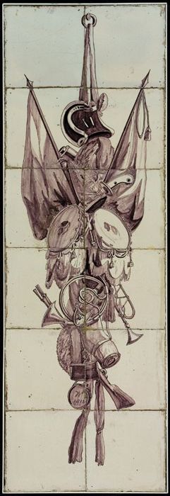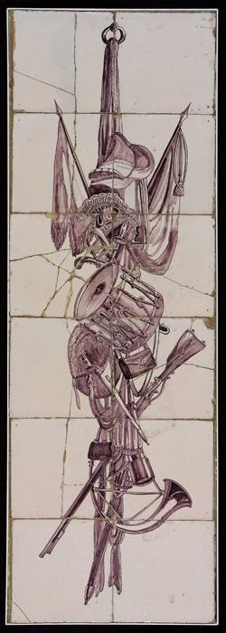 Paars tegeltableau, wapentrofee met vaandels, trom, ...