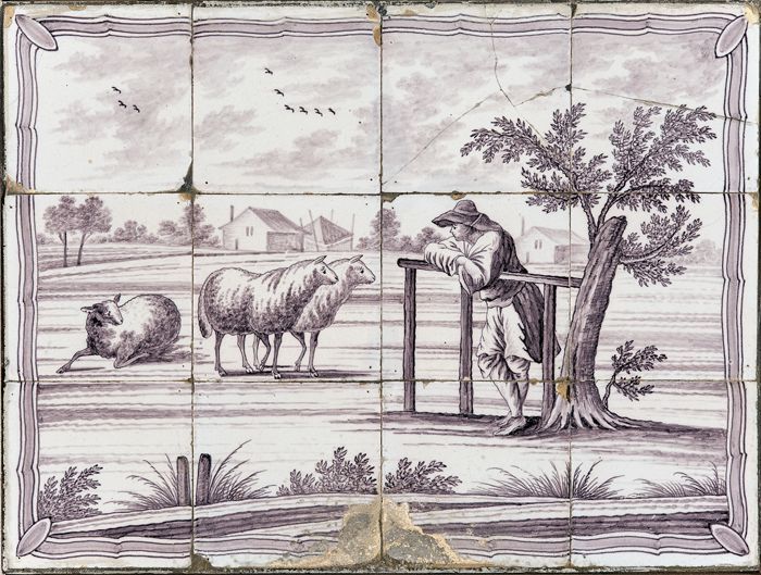 Paars tegeltableau met drie schapen en een man