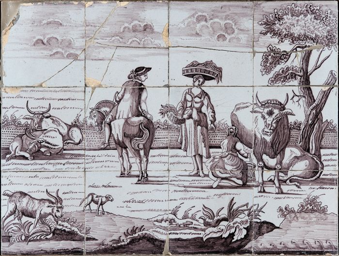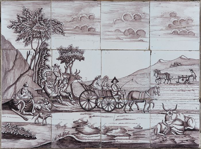 Paars tegeltableau, landbouwbedrijf met ploegende bo...