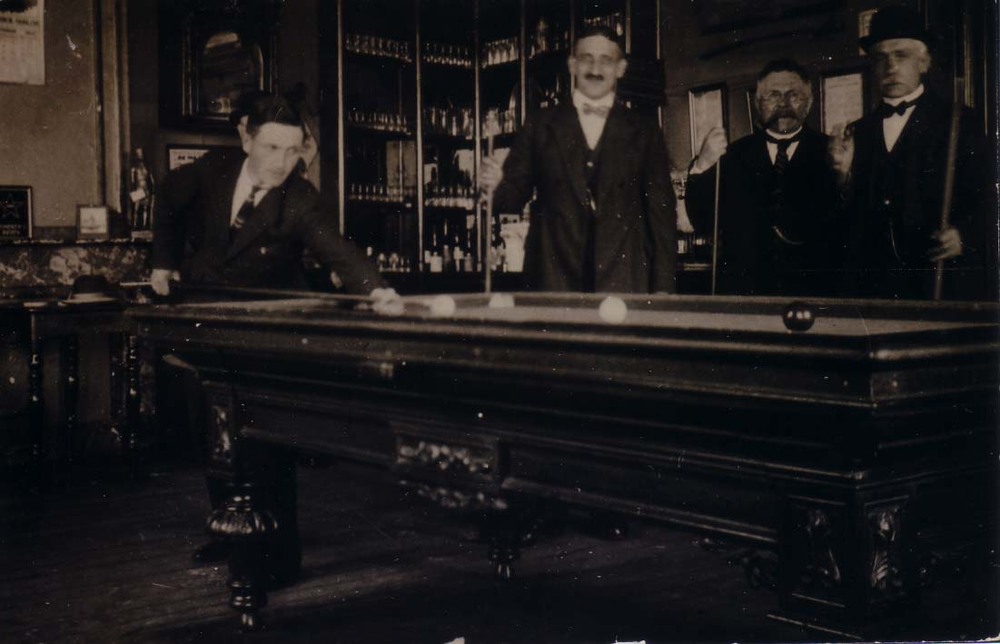 Mannen aan het biljarten in het Stadscafe op de markt.