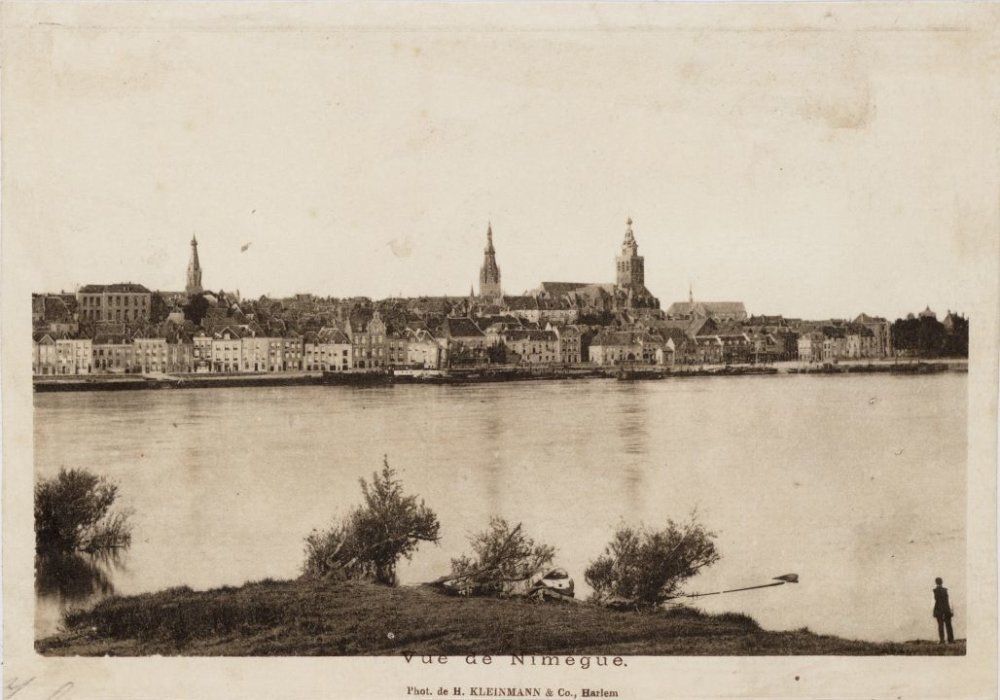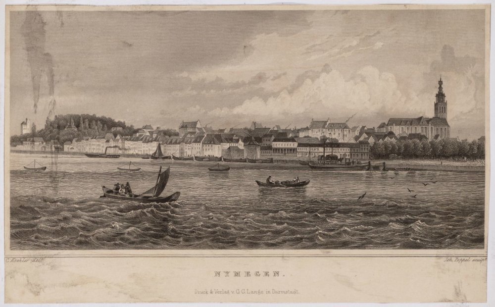 gezicht op de stad Zaltbommel vanaf het water. Gravu...