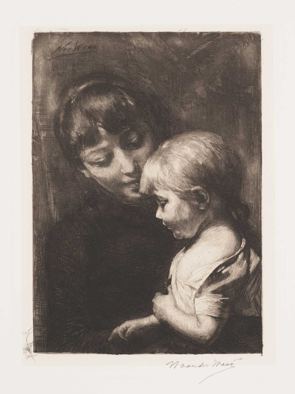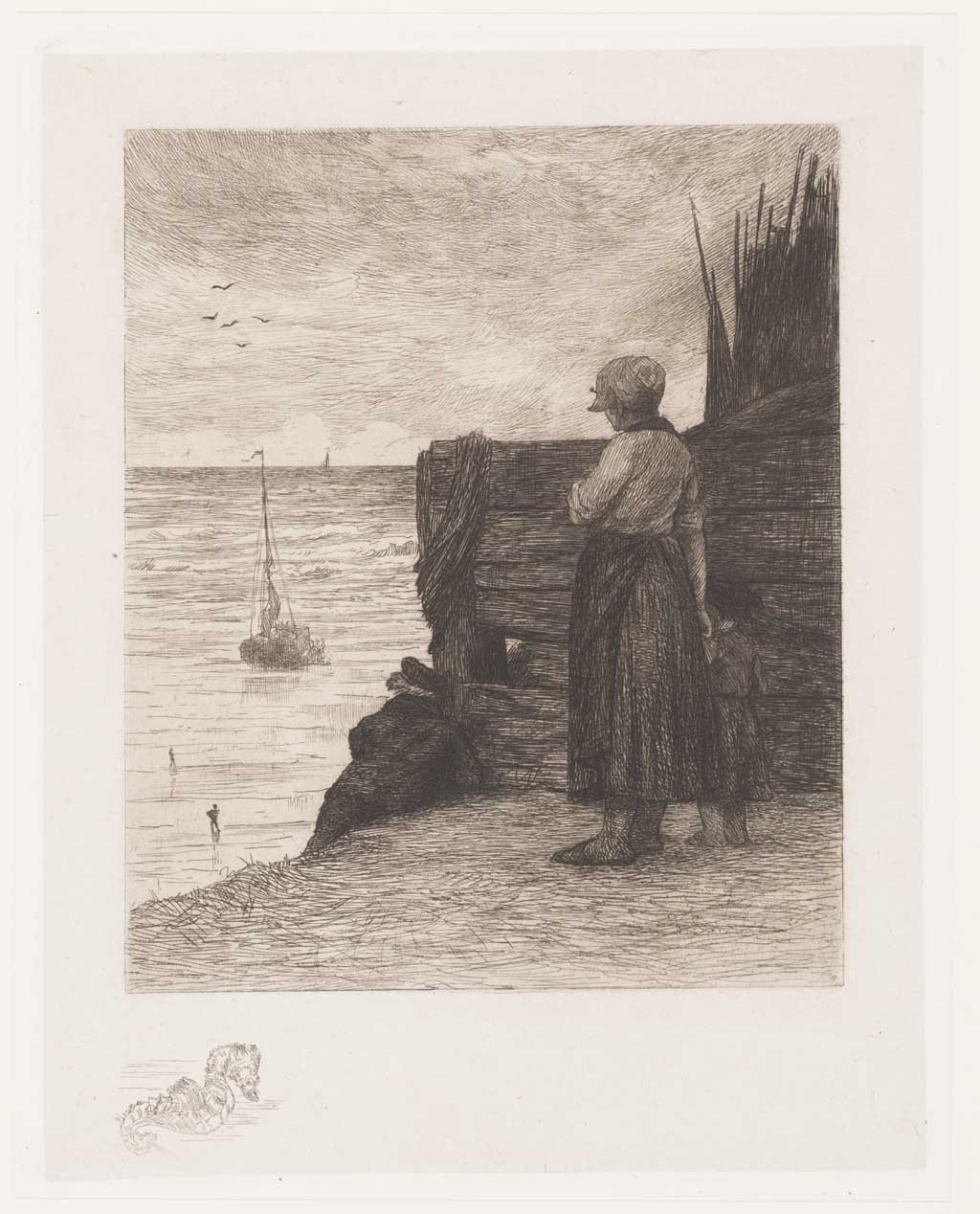 Zeegezicht, op de voorgrond een meisje met kind