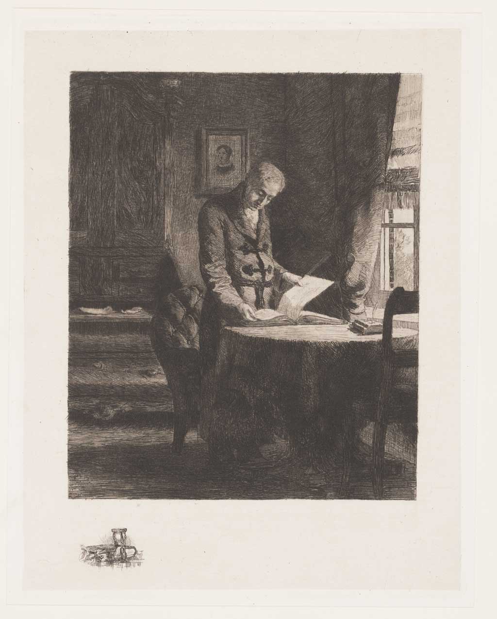 Interieur met pijp rokende man in kamerjas