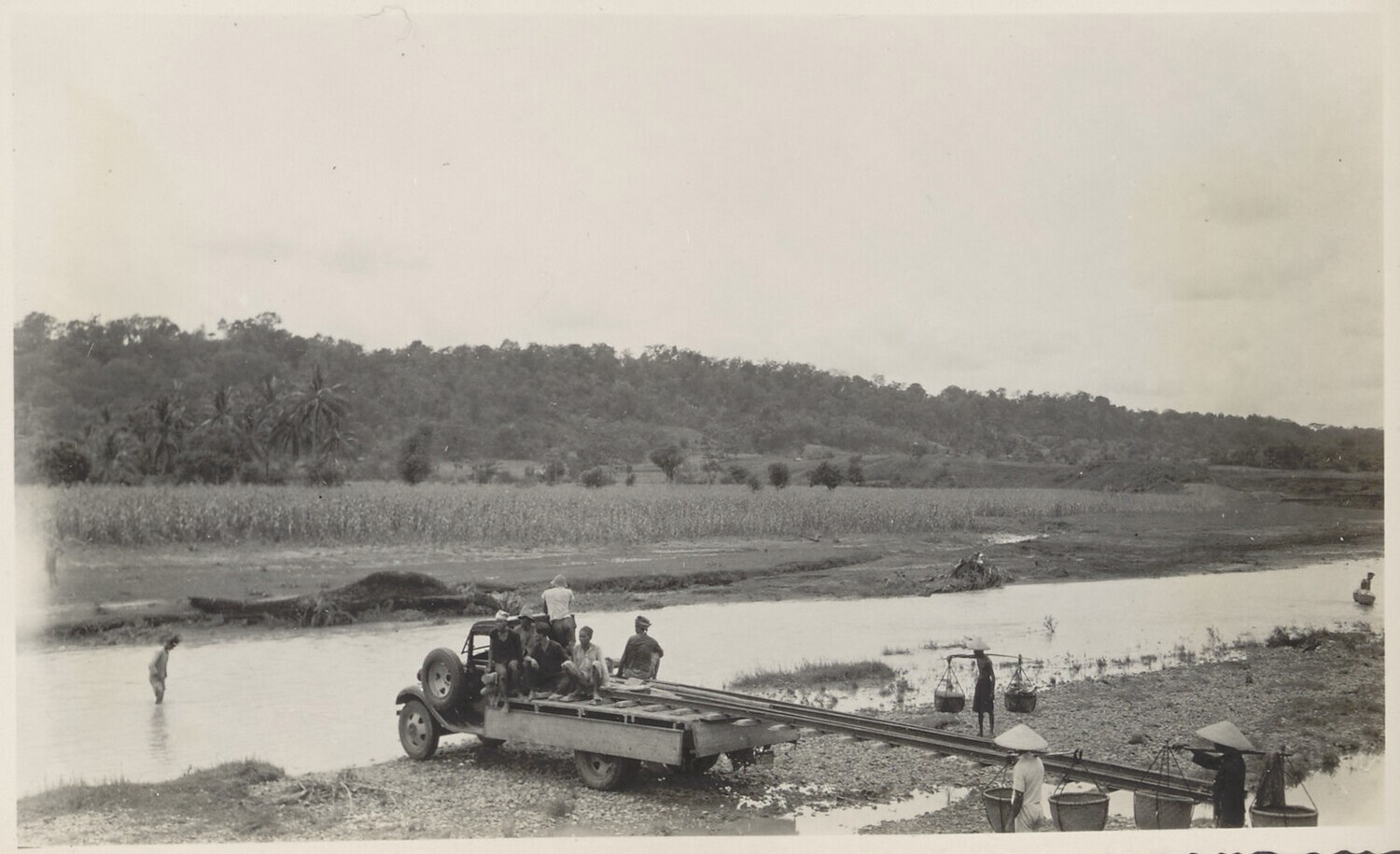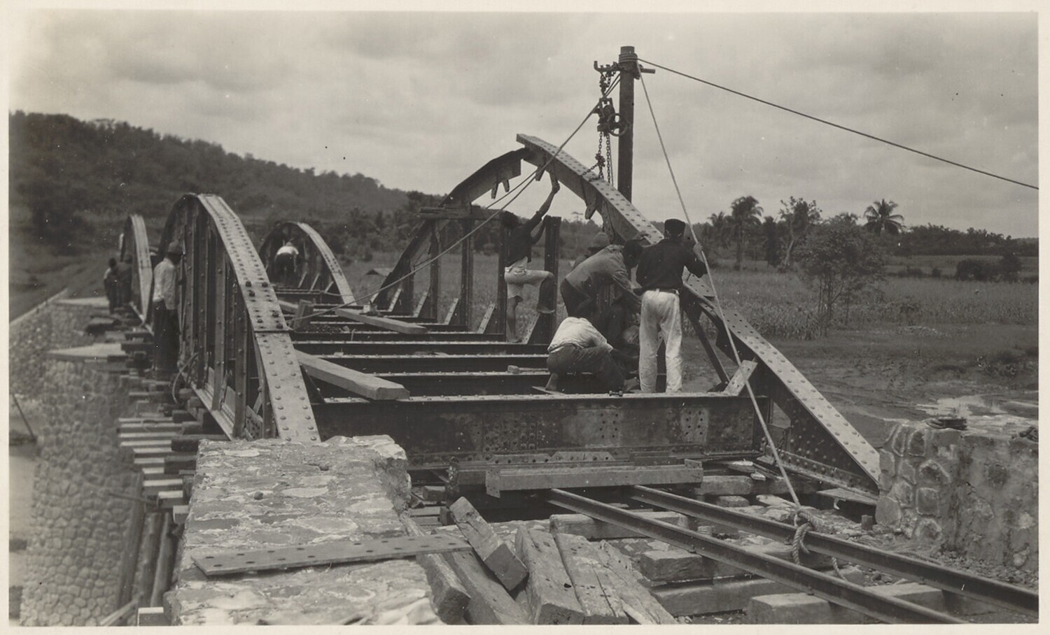 Transport van rails over de rivier de Reboejoetan