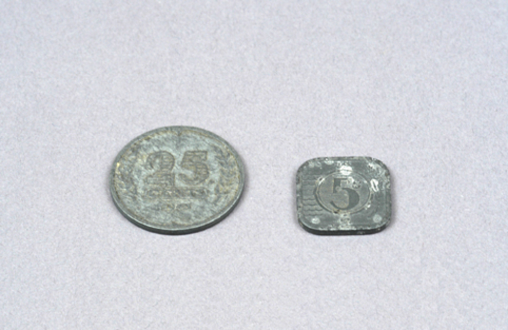 ronde 25 cents-munt van zink en vier- kante 5 cents-...