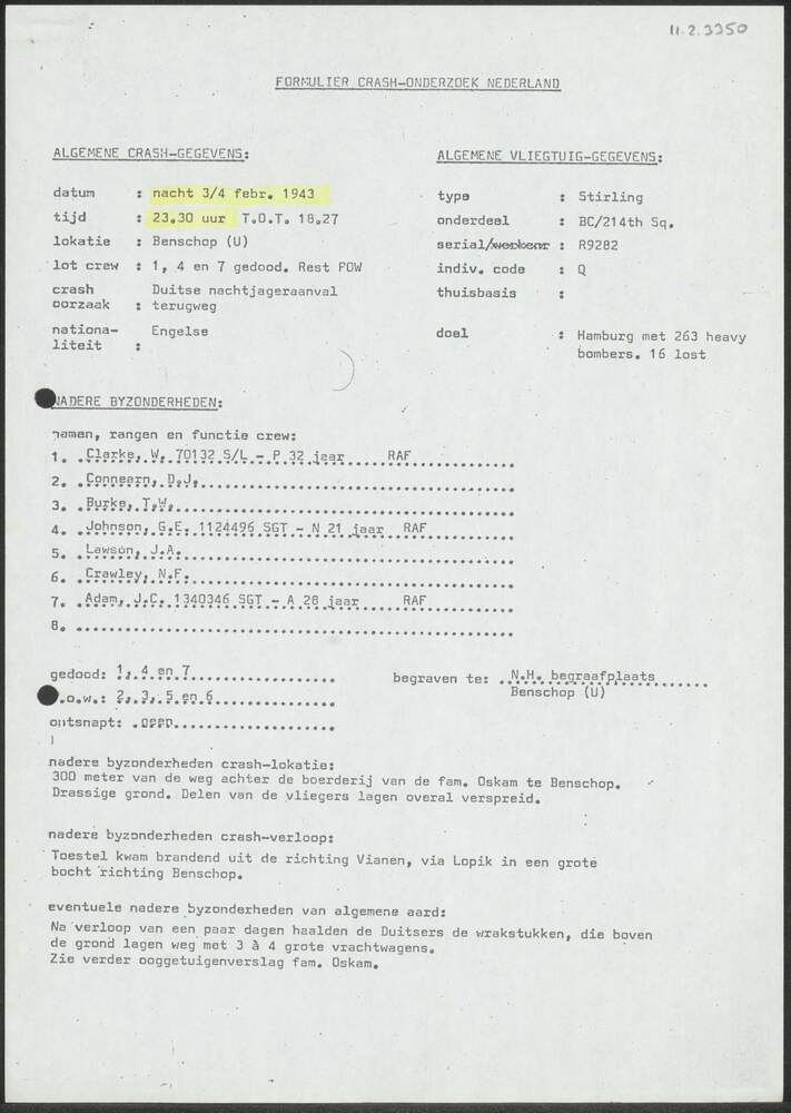 Formulier Crash-Onderzoek Nederland 03 februari 1943.