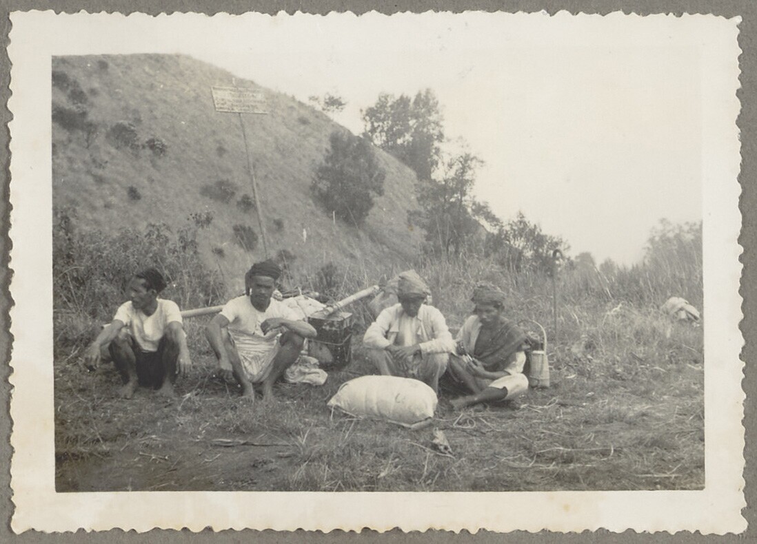 Drie Javaanse dragers zitten bij de driesprong aan d...