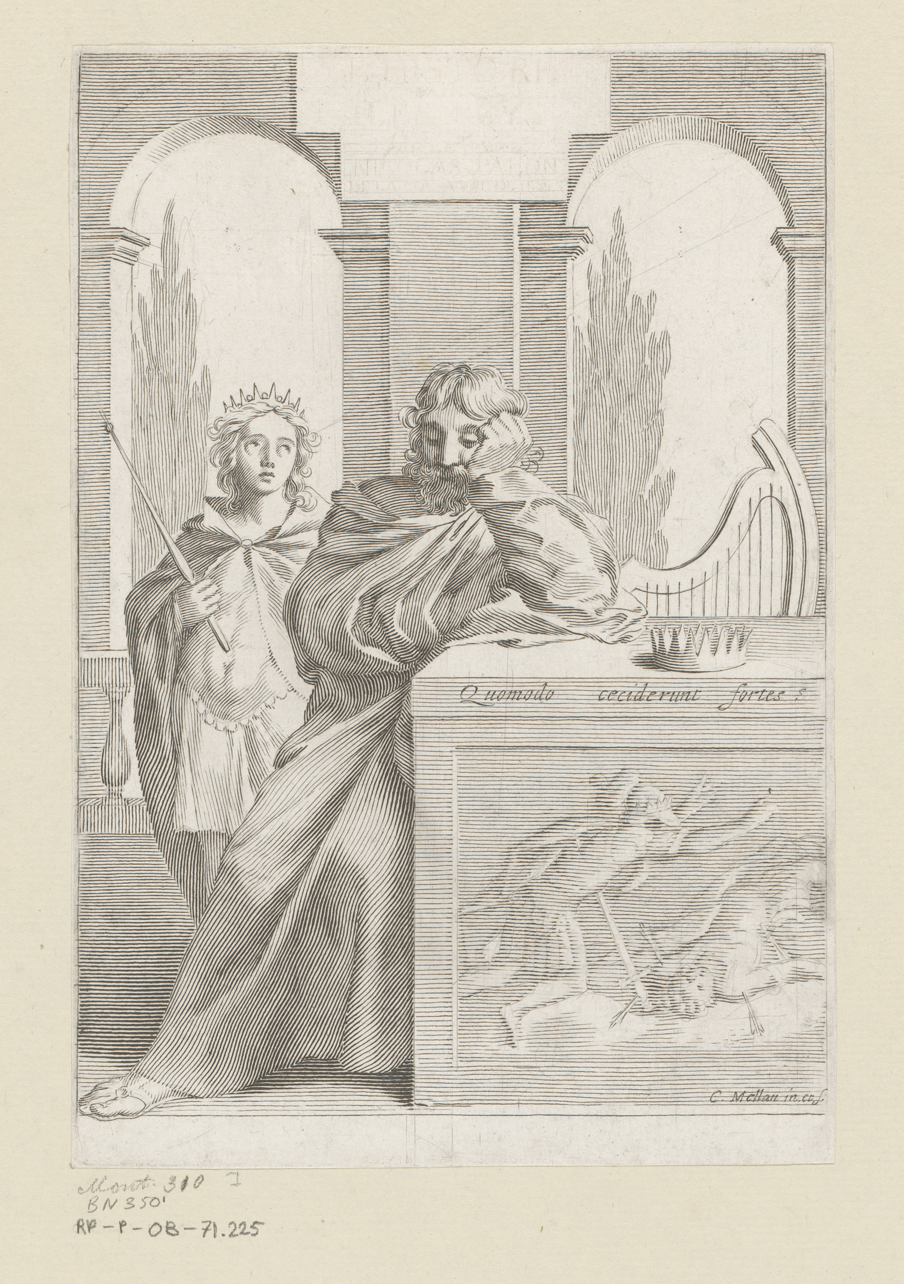 David leunend tegen een verhoging met bas-reliëf