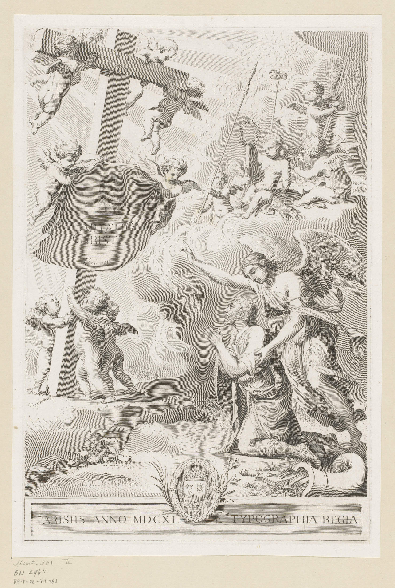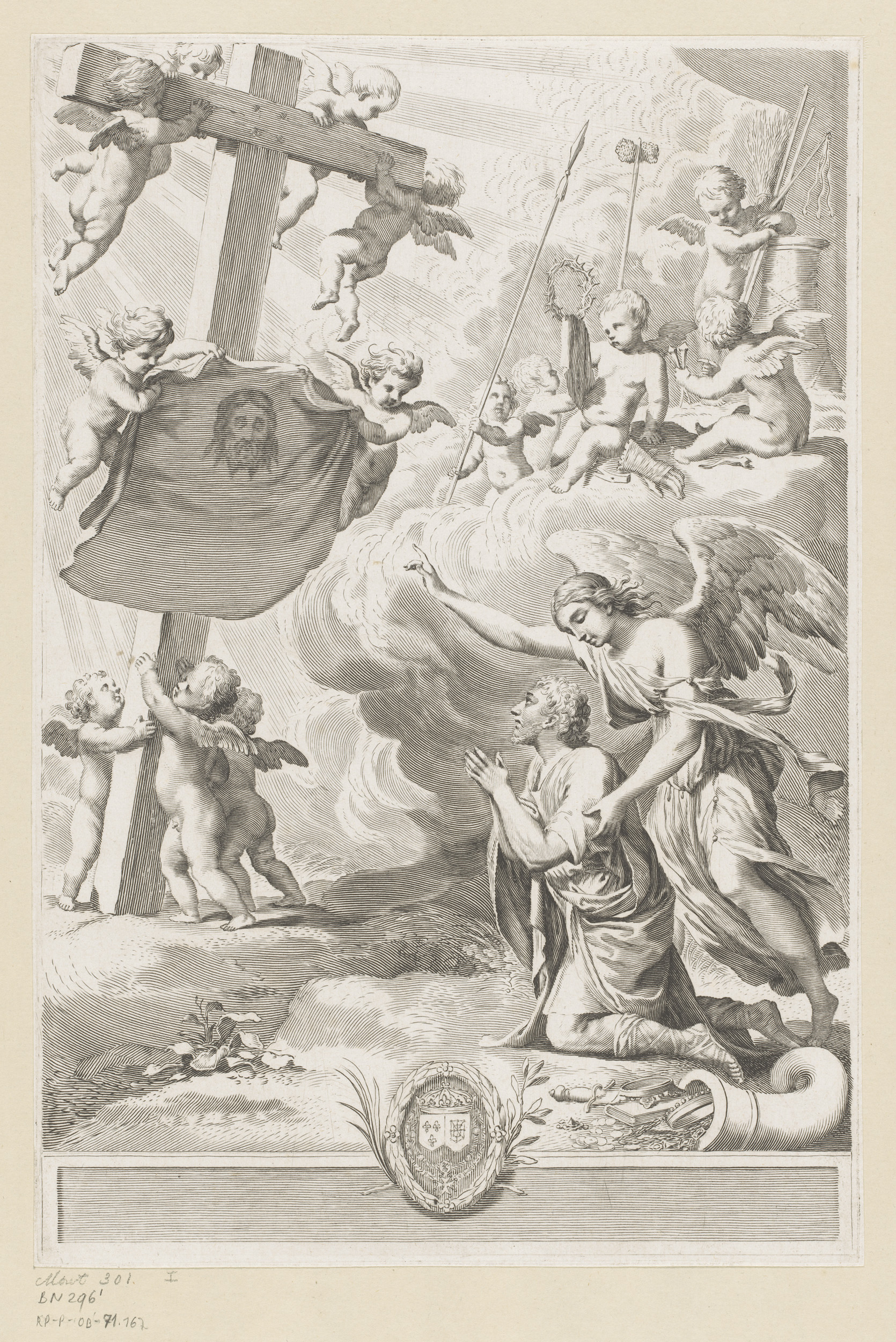 Geknielde man met engel voor het kruis van Christus ...