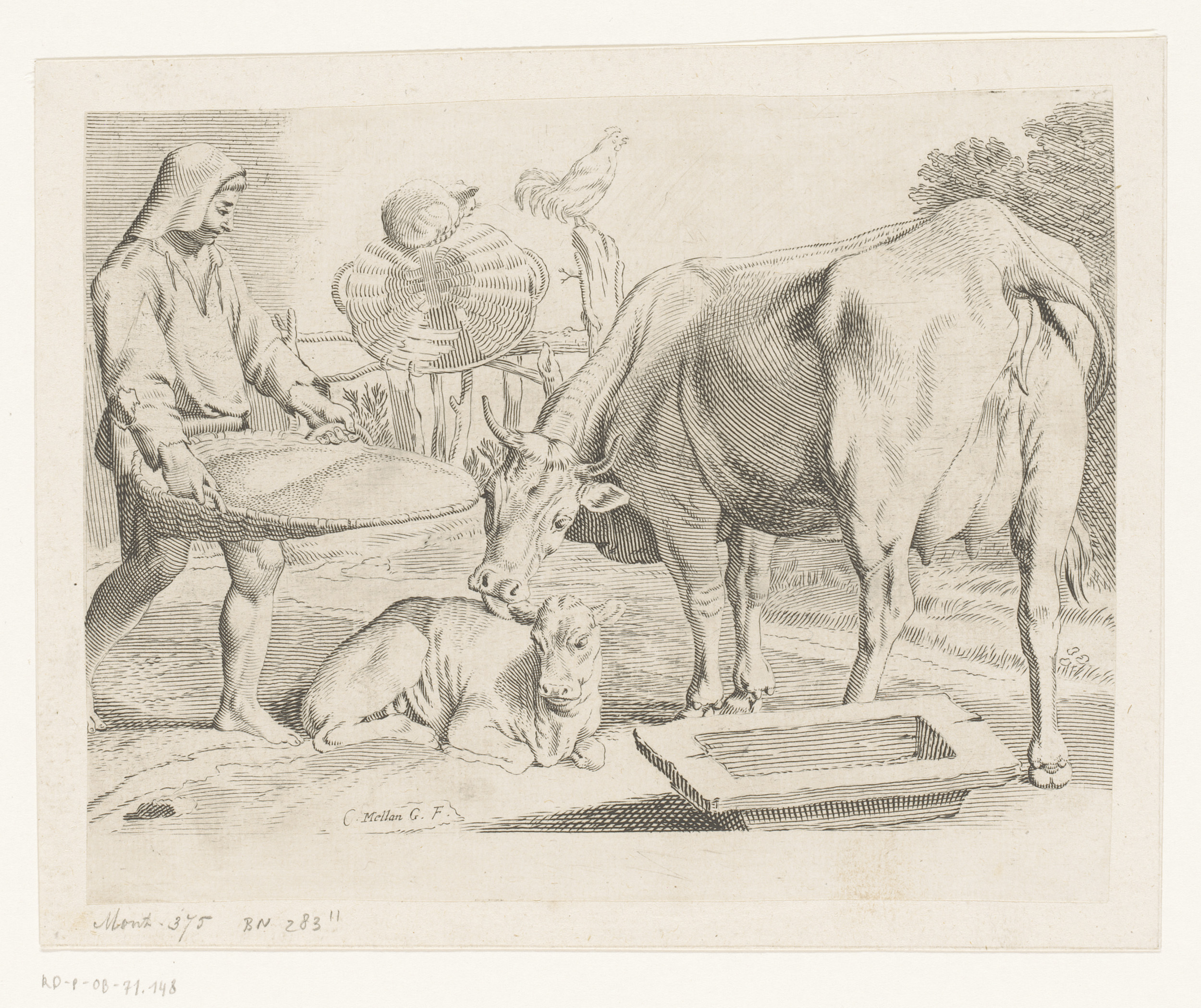Man met mand bij een koe en haar kalf