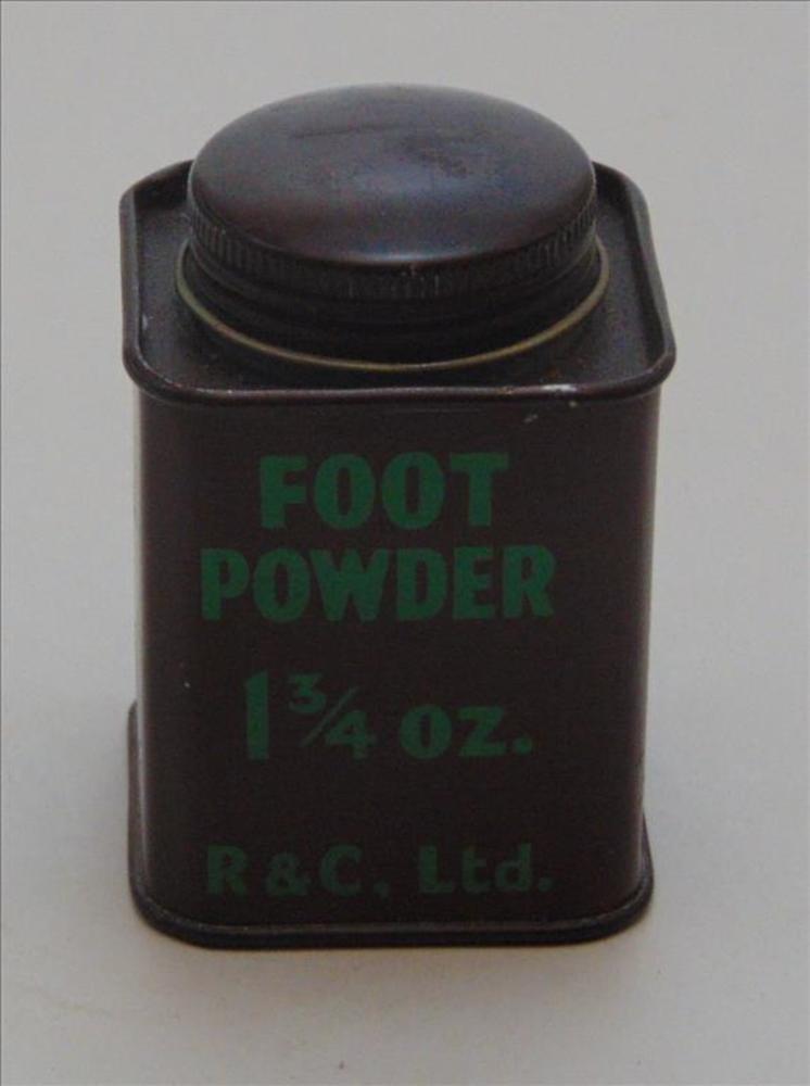 voorraadblik, Foot Powder, kleur legergroen met opdruk