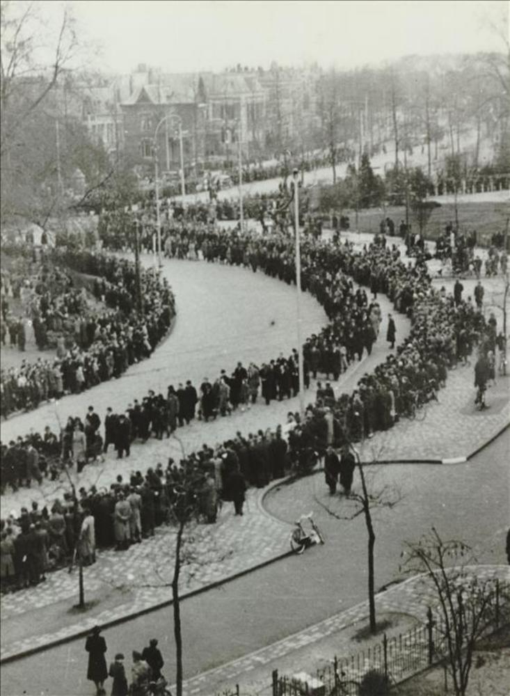 Lange stoet langs de weg (herdenking bombardement?)