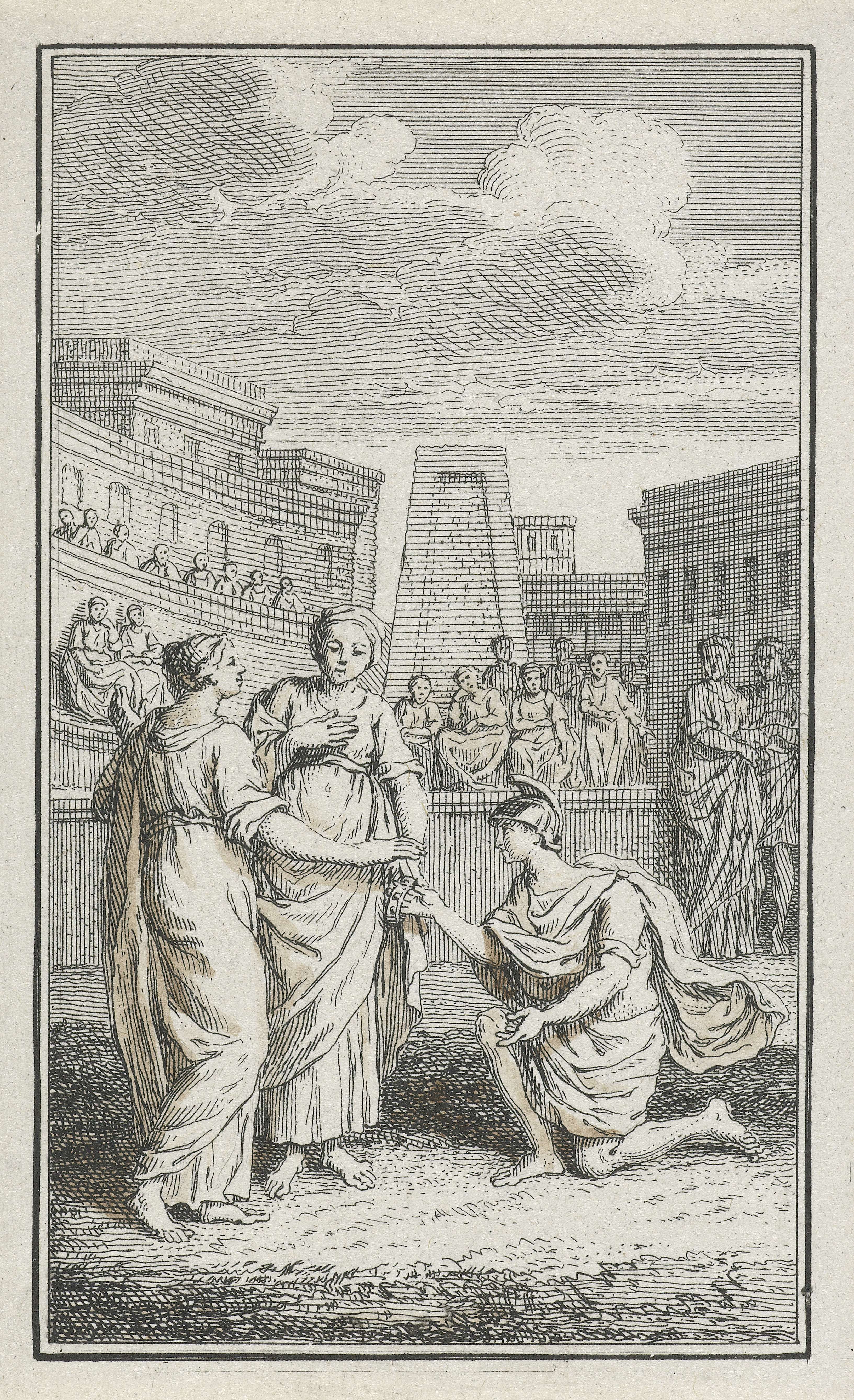 Romeinse soldaat knielt voor een vrouw