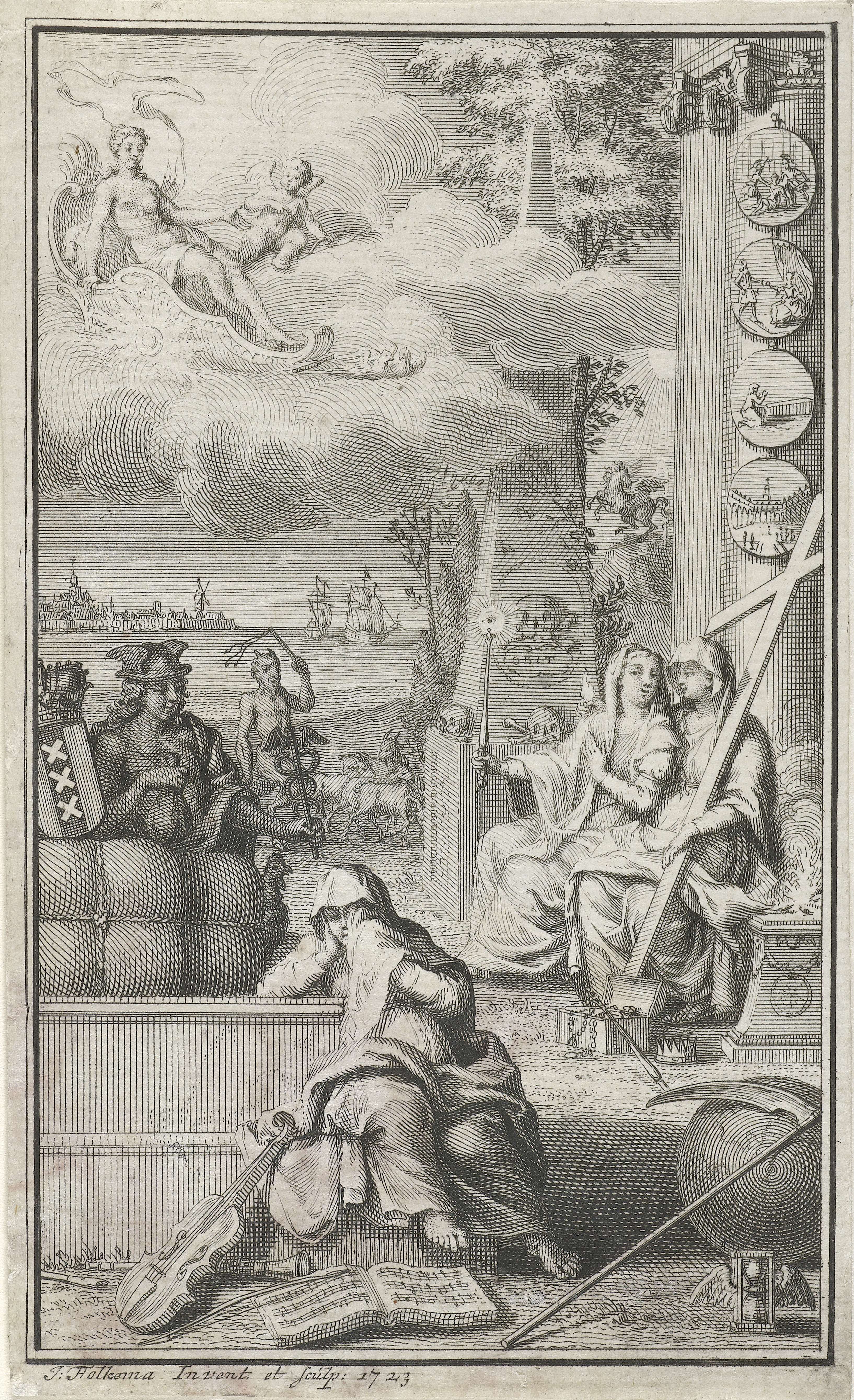 Tronende man omringd door allegorische figuren
