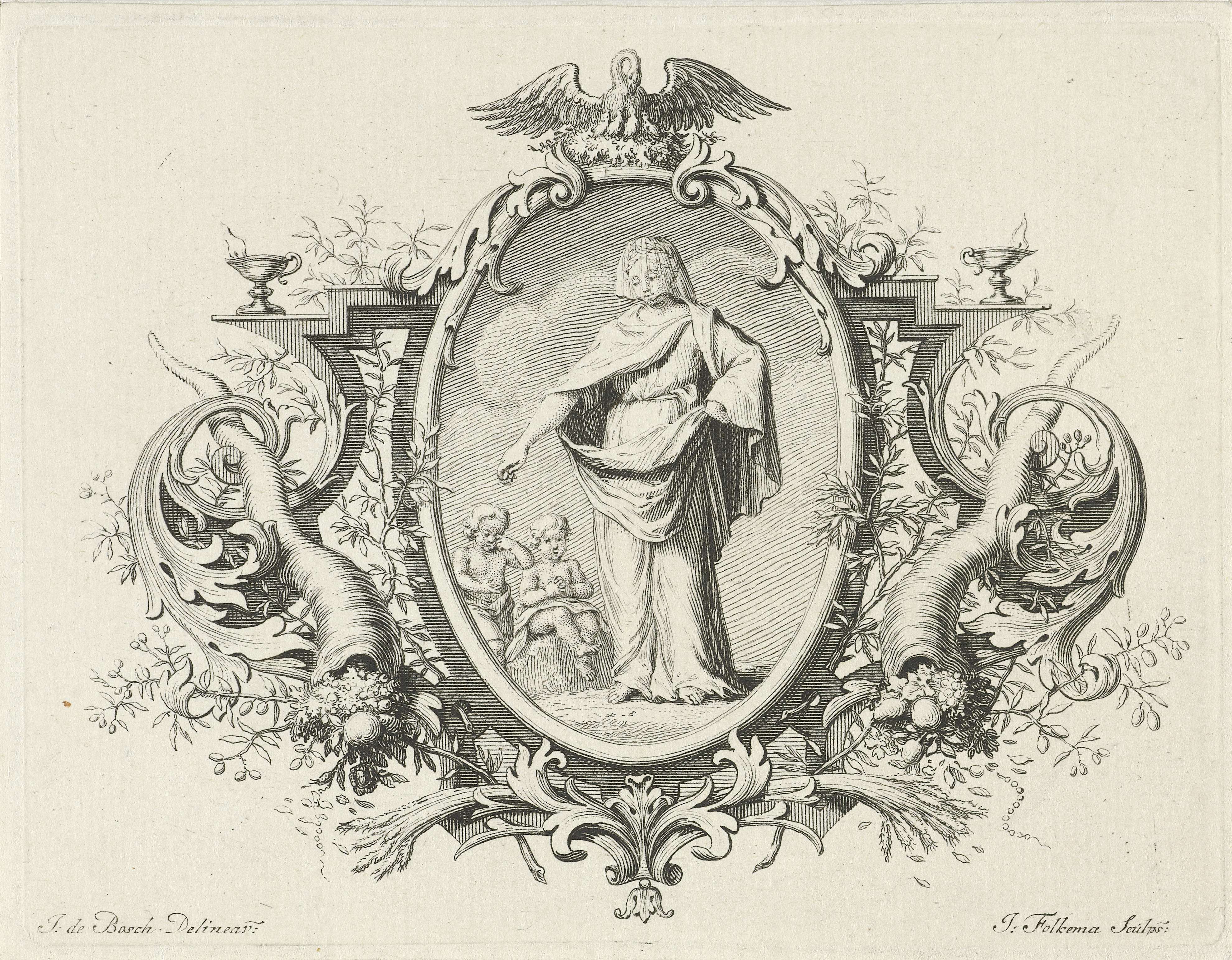 Wapenschild geflankeerd door allegorische figuren