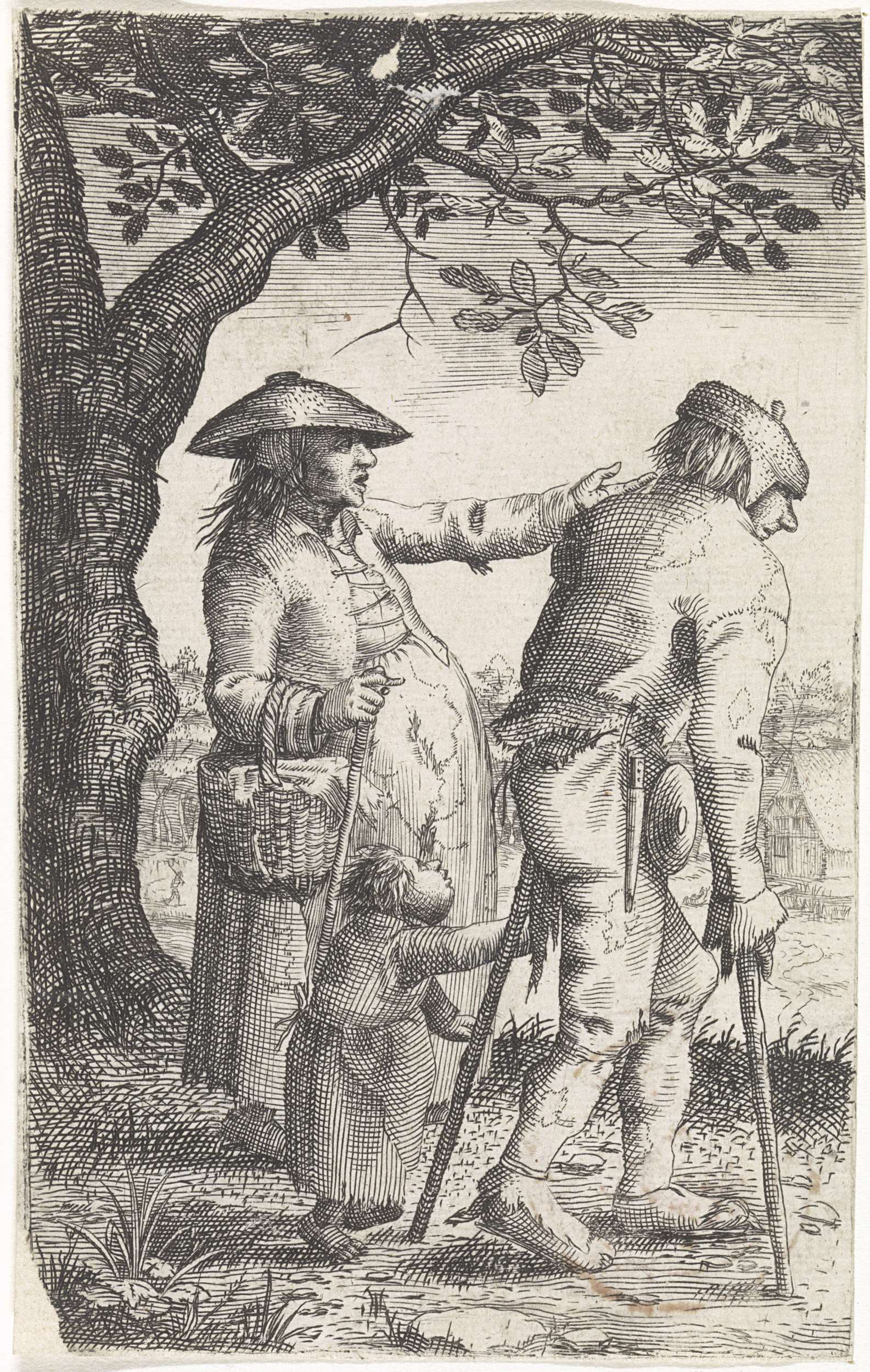Bedelaars op krukken bij een vrouw en een kind
