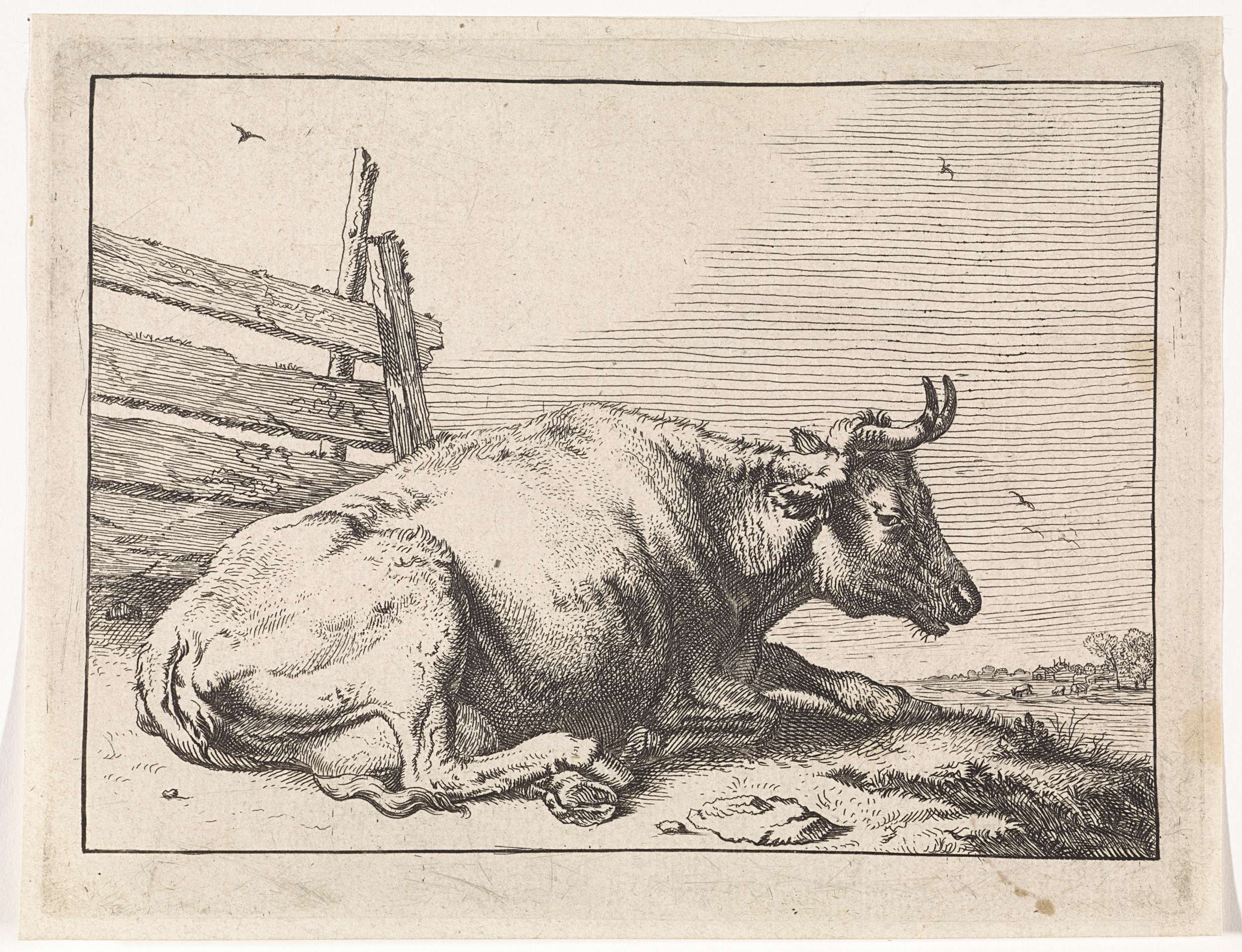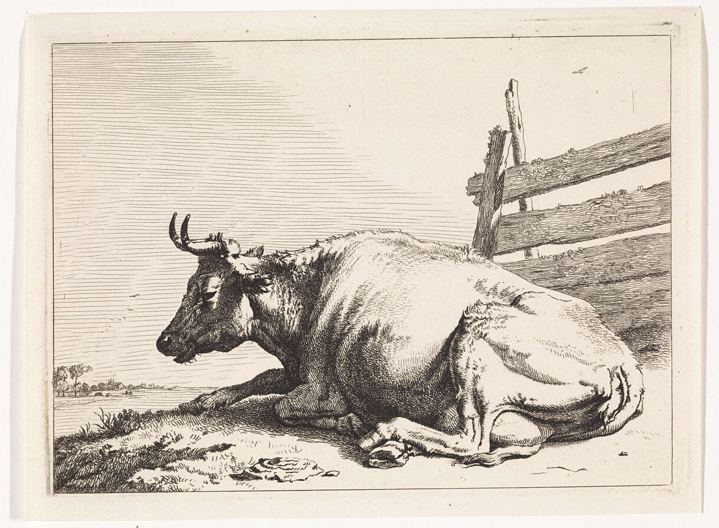 Liggende koe bij een hek