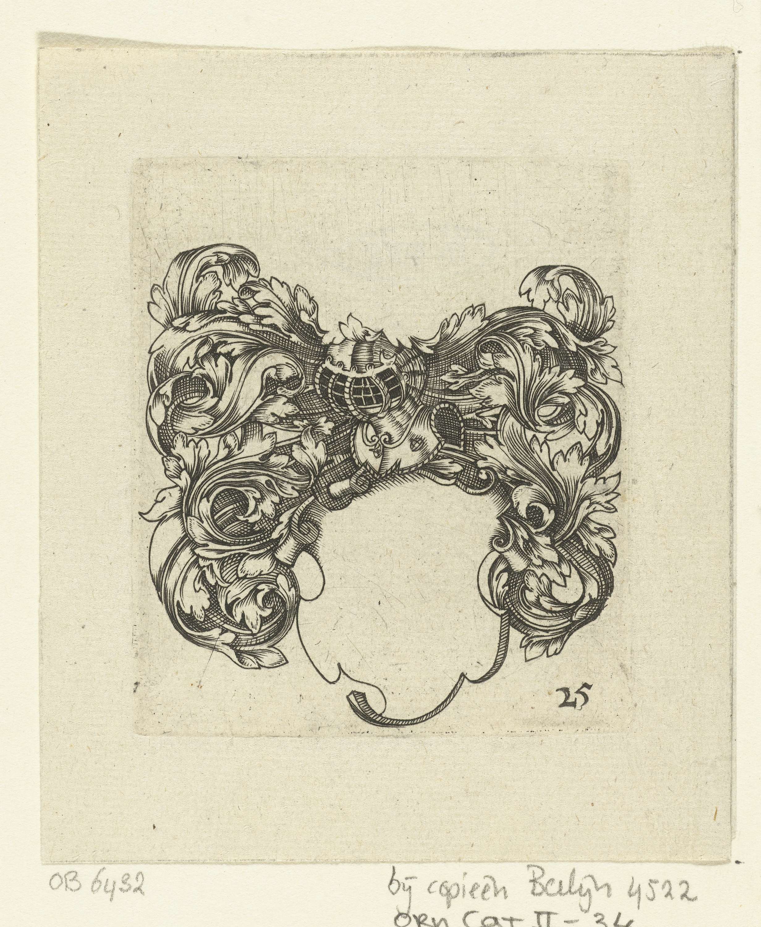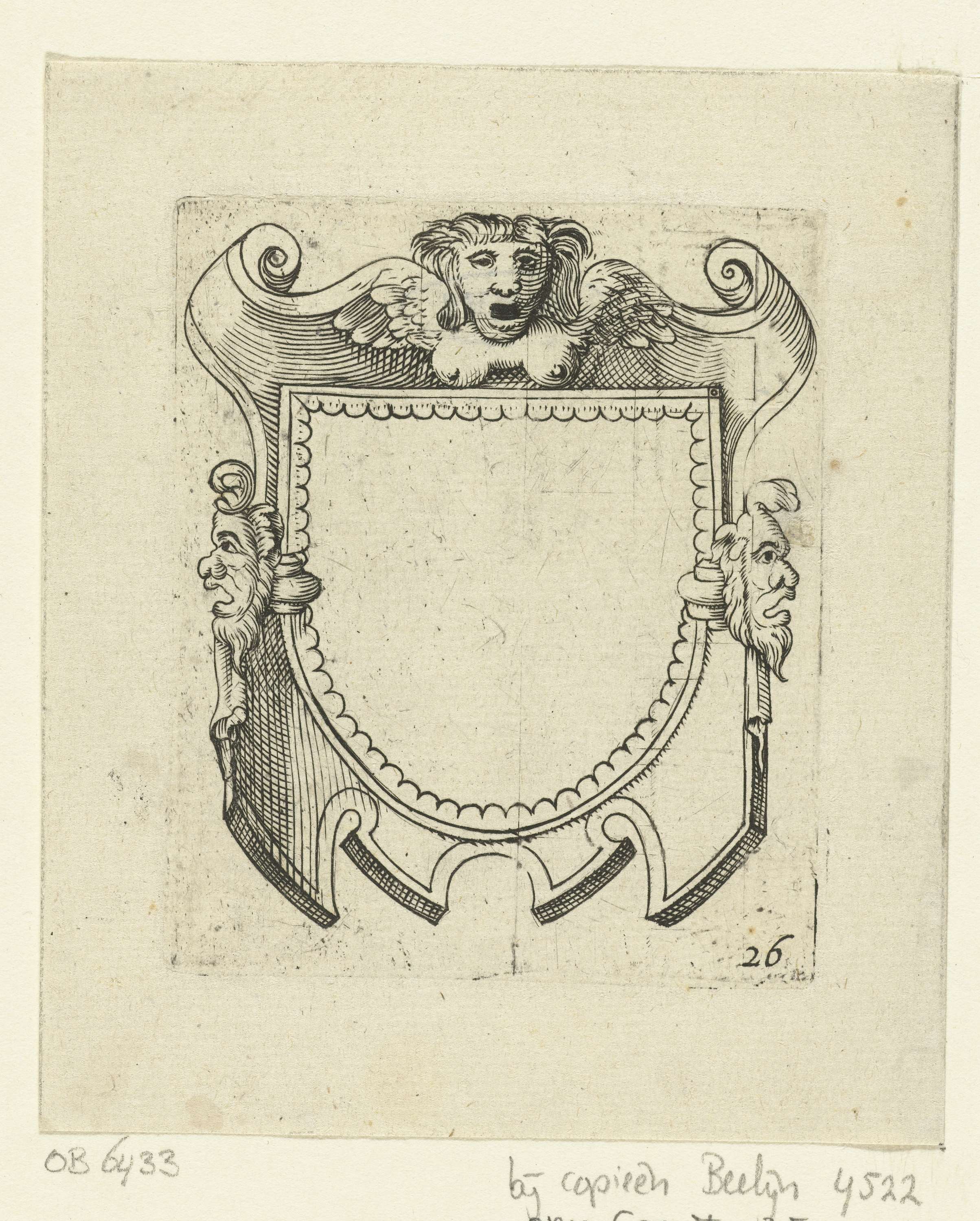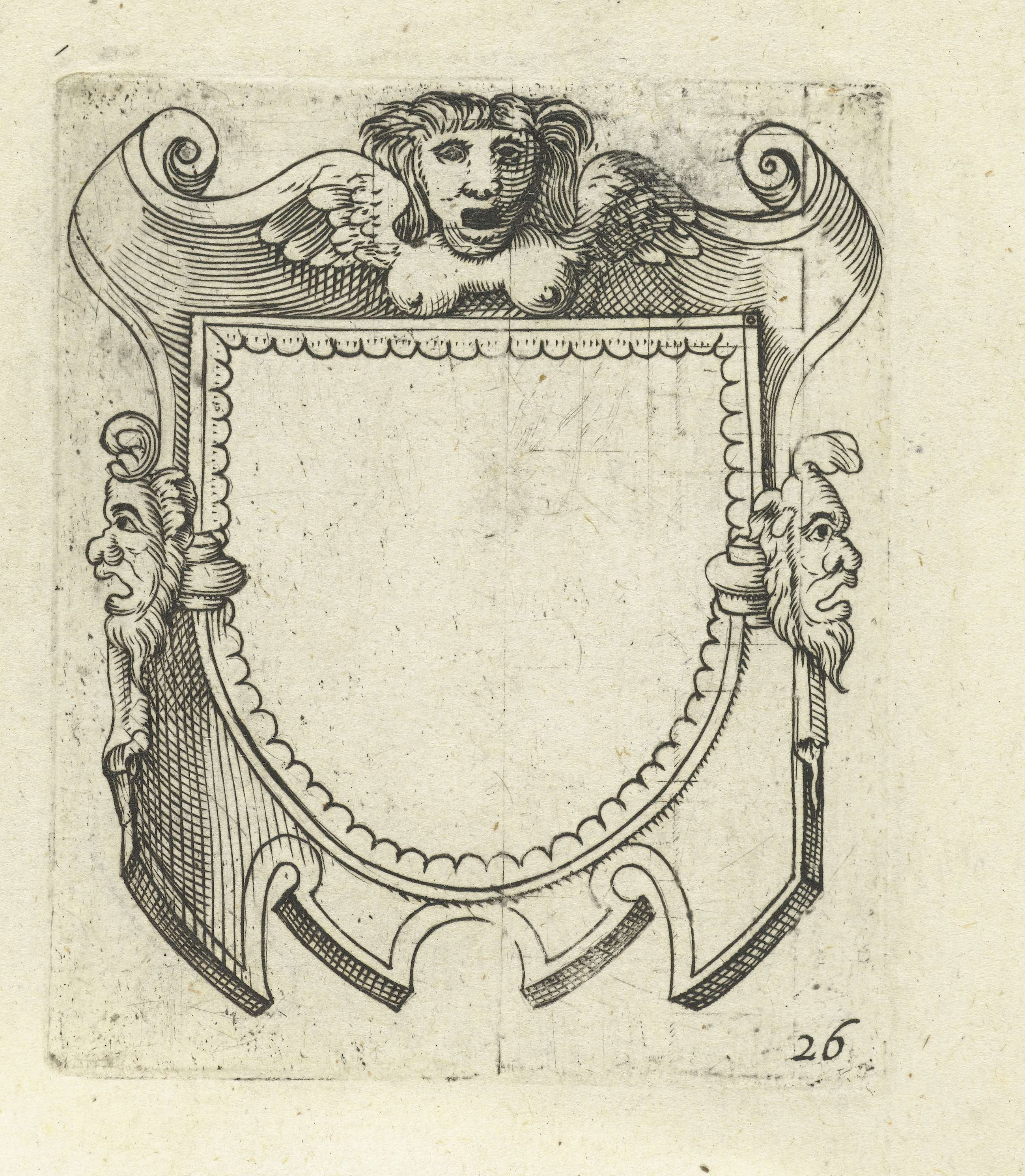 Halfrond veld in rolwerkcartouche met maskers