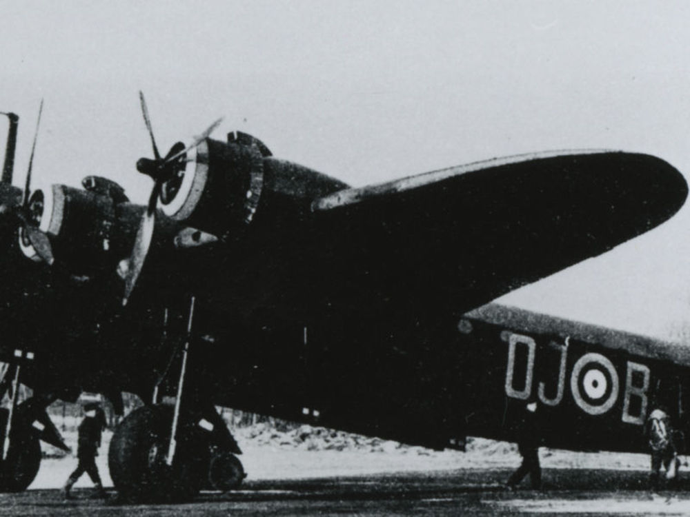 Foto van Short Stirling DJ-B op de grond. Tekst: "Ee...