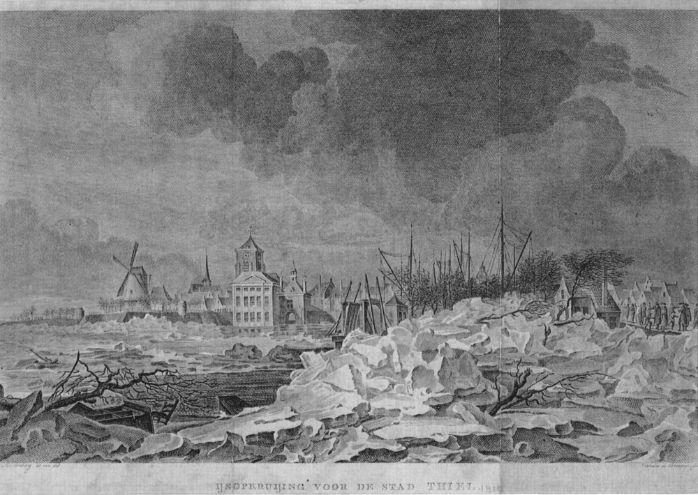 Gravure, voorstellende kruiend ijs voor de stad Tiel...
