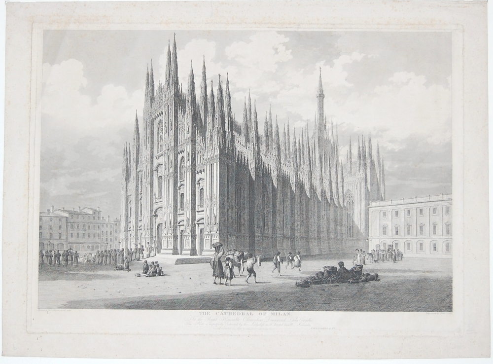 Gezicht op de kathedraal van Milaan. Opschriften. En...