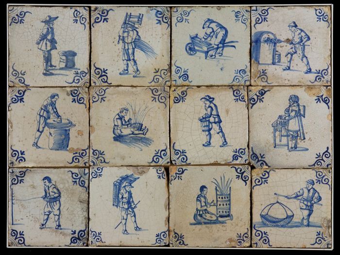 Tegelveld, twaalf tegels, blauw, beroepen, hoekmotie...