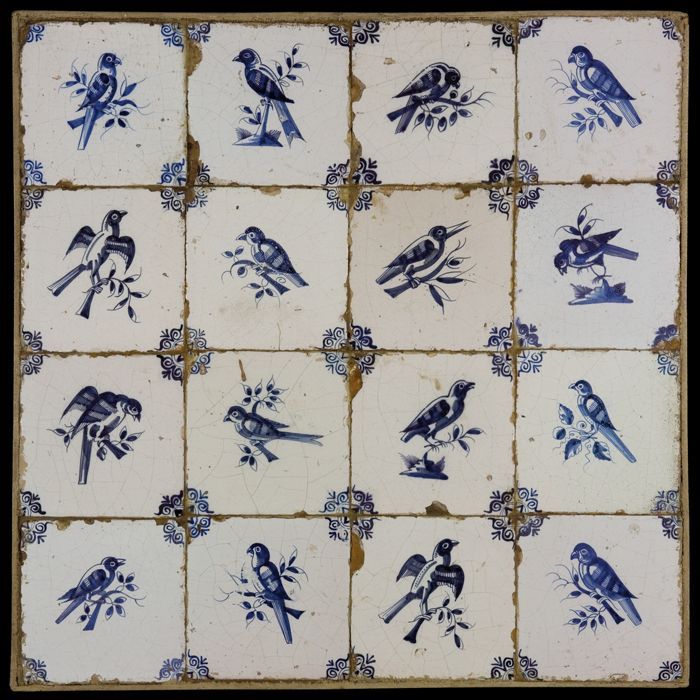 Tegelveld, zestien tegels, vogels op tak, hoekmotief...