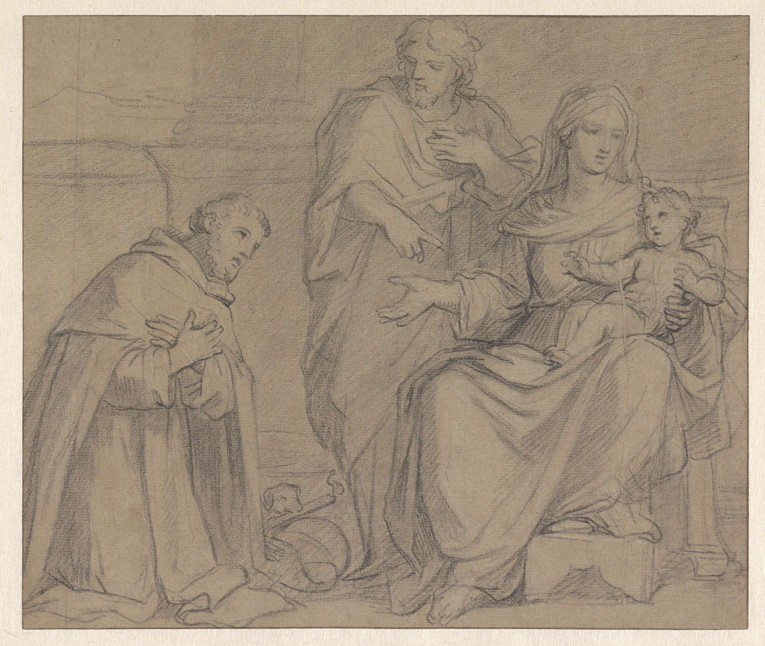 De heilige familie aanbeden door een monnik met een ...