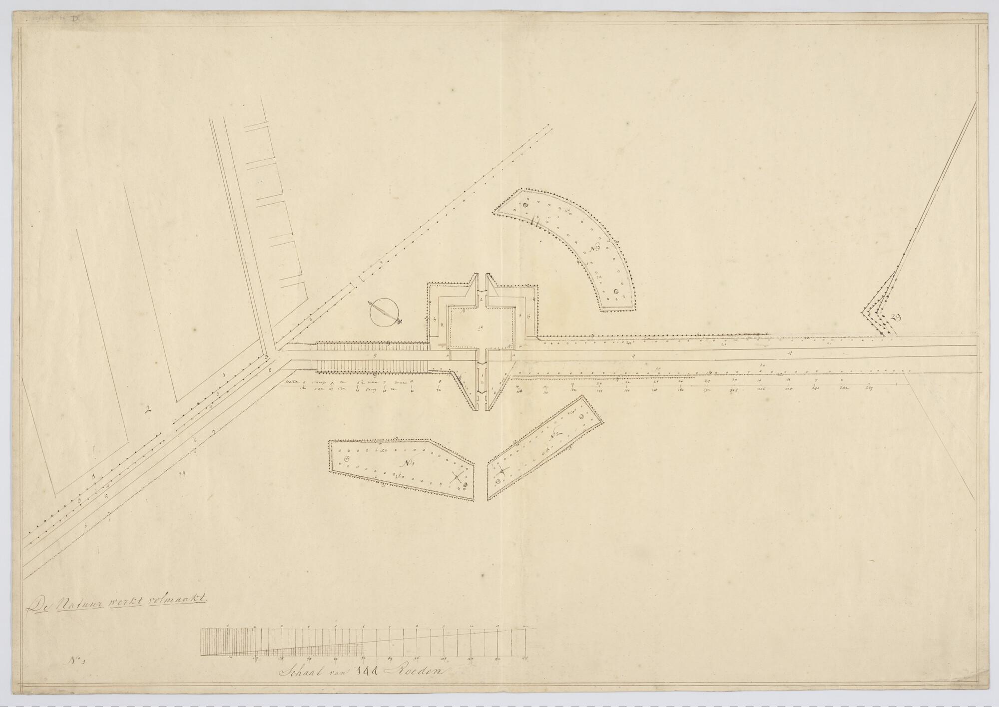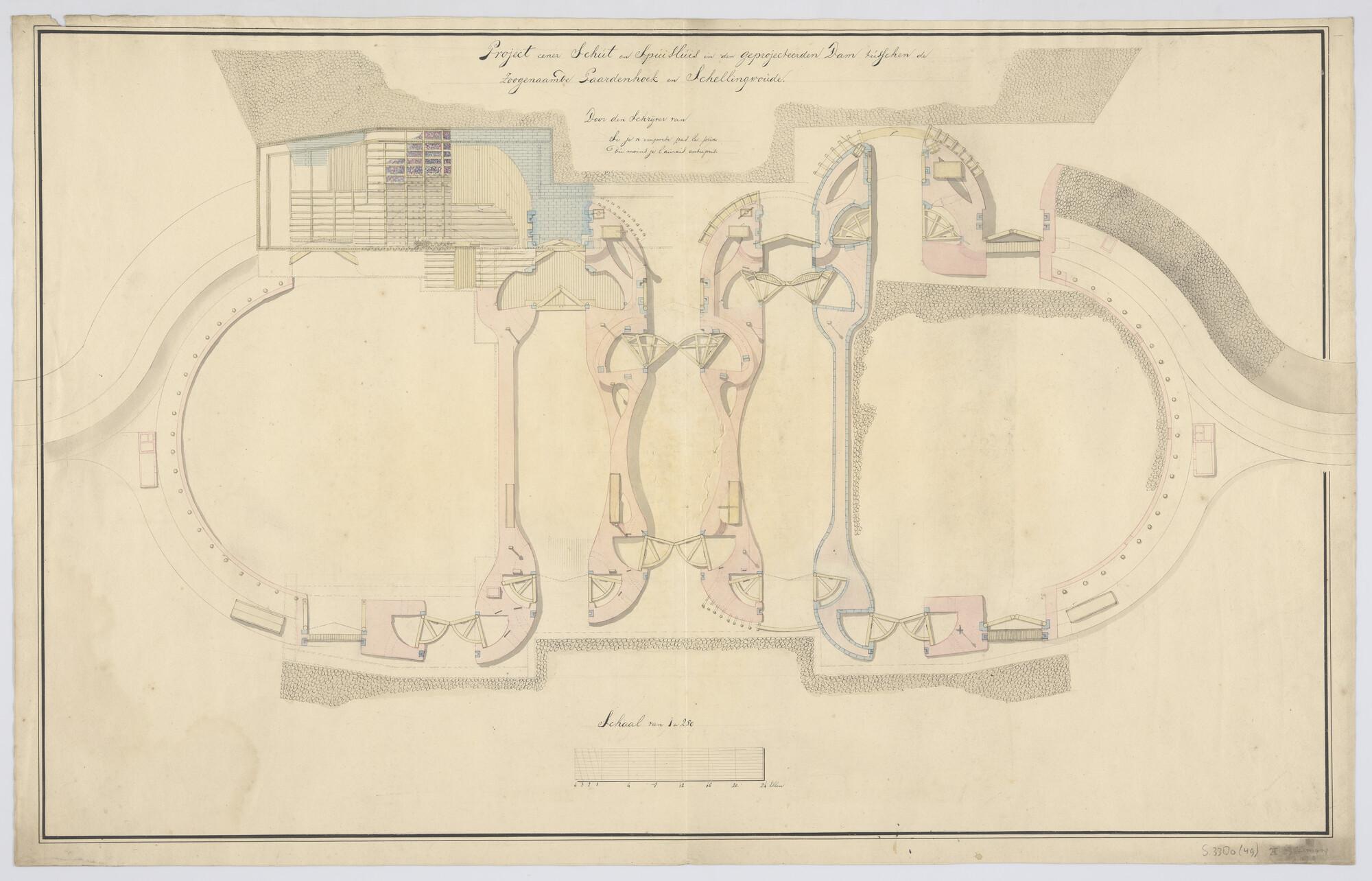 Plattegrond van een dam met sluizen tussen de Paarde...