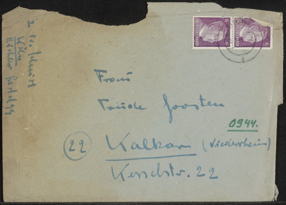 Blauw/grijze envelop aan Frau Trude Joosten Kalkar