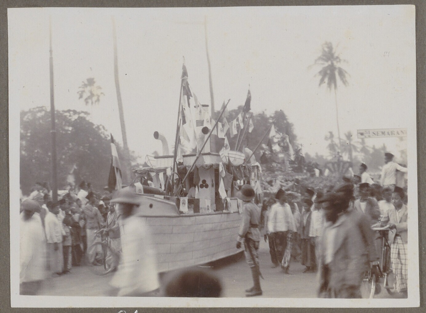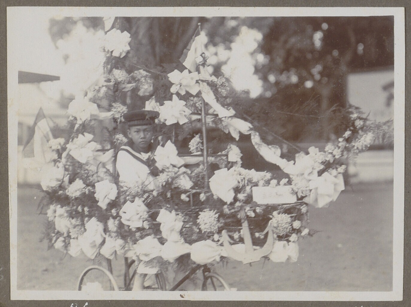 Javaanse jongen op met bloemen versierde fiets tijde...