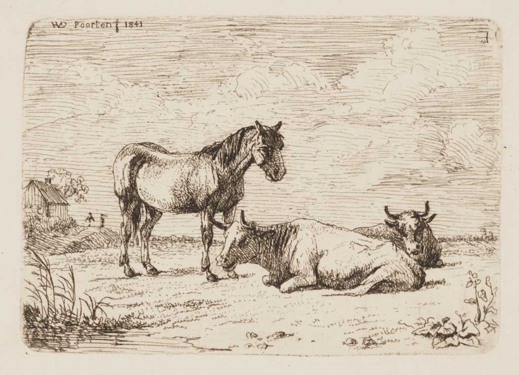Landschap met twee liggende koeien en een staand paard
