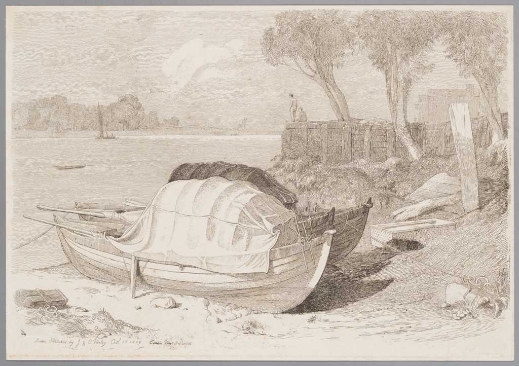 Riviergezicht met op de voorgrond twee overdekte roe...