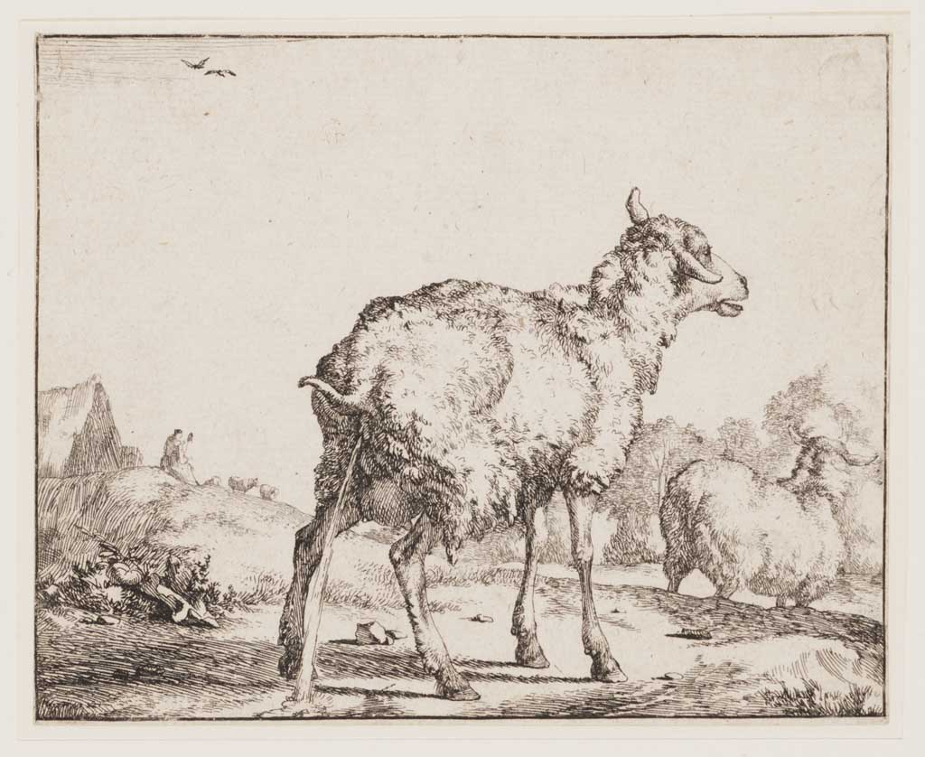 Landschap met twee schapen waarvan er één water drin...